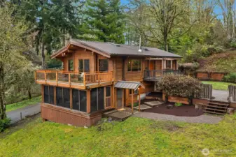 Quartermaster Harbor view cedar home on a sunny, west-facing half acre with sunset views, timeless craftsmanship, and beautifully updated interiors. With 3 bedrooms, plus another room for office or overflow sleeping space, and 2,320 square feet, this home offers the ideal blend of warmth, style, and functionality. The open-concept kitchen and main living area feature vaulted ceilings, hardwood floors, granite counters, and modern finishes throughout, creating a space that feels both elevated and inviting. Updated bathrooms, rich wood detailing, and solid wood construction with interlocking cedar joinery add depth, character, and enduring quality. Enjoy long summer evenings on the spacious view deck, quiet mornings in the screened porch, and a private yard with fenced garden space. Metal roof, natural gas service, and Xfinity/Comcast availability. Close to public beach access and just minutes to town and schools. A rare opportunity to own a distinctive Vashon home with water views, privacy, and soul.