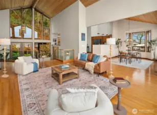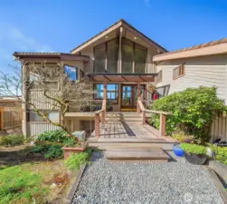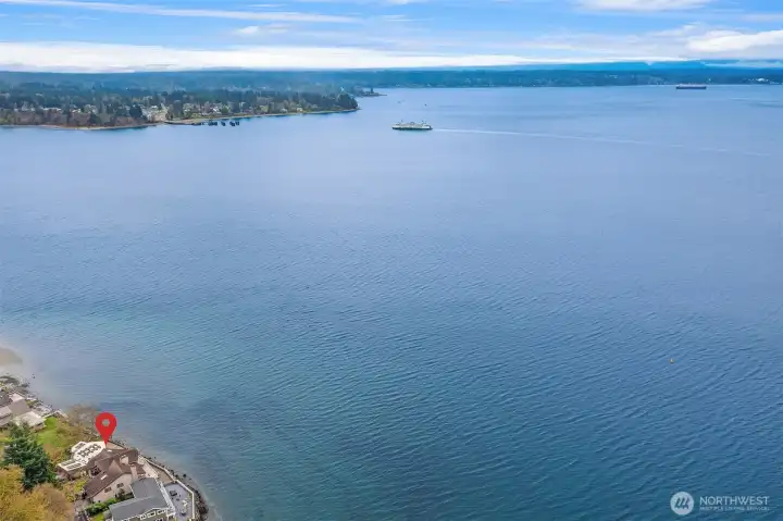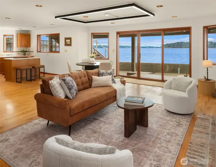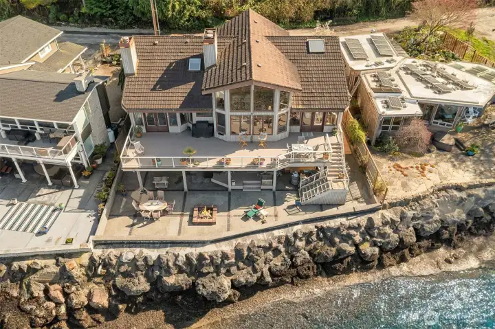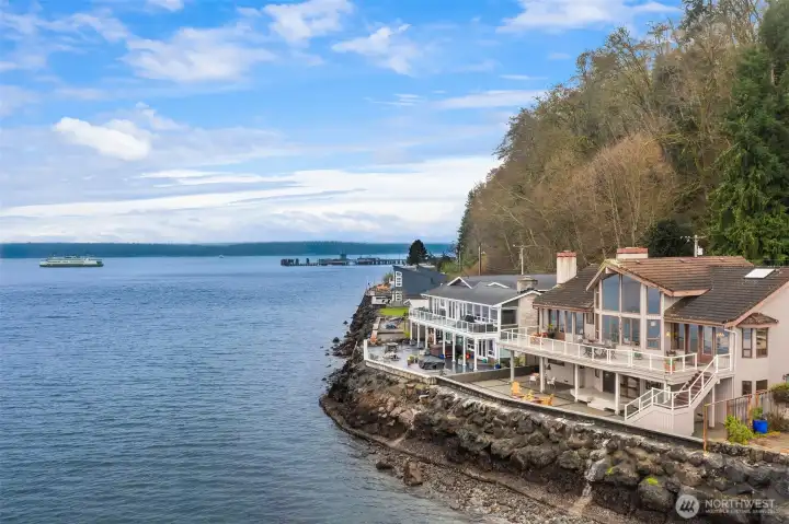 Nestled in one of Vashon's coveted North-end locations, this contemporary-style, low bank waterfront home features unparalleled views! The soaring ceilings and towering windows provide an unobstructed panoply of visual delights: Sound, mountains, city lights, Orca Pods, and ferries! The 3 BR, 2 1/2 bath, 4,000+ sq. ft. home features voluminous main level living space, large open kitchen, and dining area. Lower level includes a living area w/fireplace, 2nd kitchen, Bonus room, hobby room, and workshop. Two full stories with separate living spaces and private entries to each level, offers a multitude of options. Spacious 2 car garage. Custom engineered concrete reinforced rock bulkhead. Patio and deck offer abundant opportunities for outdoor entertaining. Two-minute commute to the ferry! Separate, unattached waterfront lot w/80 ft. of fontange also available.