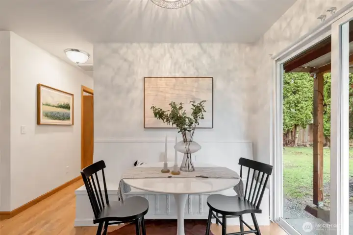 Move-in ready 3bd/1bth rambler on a quiet, corner lot in Shoreline. Designed for efficient, single-level living, the home offers a smart floorplan & comfortable spaces. Fresh interior & exterior paint with cheery front door. Home was entirely rebuilt 10 yrs ago with all new electrical, plumbing, double-pane windows, & energy efficient furnace. Light & bright main living area boasts hardwood floors & wood burning fireplace. Roomy galley style kitchen with large window facing the backyard, wood cabinetry & stainless-steel appliances. Dining with built-in seating in front of sliding doors to the covered outdoor entertaining space. Ample closet space. Situated on a low maintenance, peaceful, fully-fenced level lot, featuring a spacious yard which backs up to green space with no direct neighbors. 1 car garage plus attached shed. New roof 2019. Home at end of quiet residential street. Private and serene yet ideally positioned near local amenities, capturing the essence of PNW living. Enjoy a variety of outdoor recreation options. Excellent commuter location near I-5, Sound Transit Link Light Rail & bus lines. Easy stroll to groceries, your choice of gyms, coffee shops, dining & parks. Where Shoreline, Lake Forest Park & Montlake Terrace connect, this highly desirable location offers the perfect blend of comfort, convenience, & community all within the popular Shoreline School District. Professionally pre-inspected for buyer confidence.