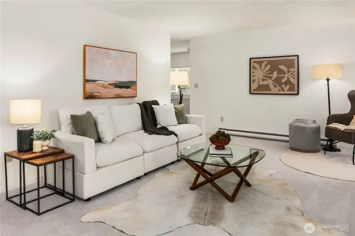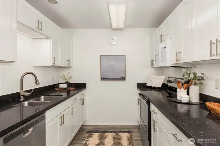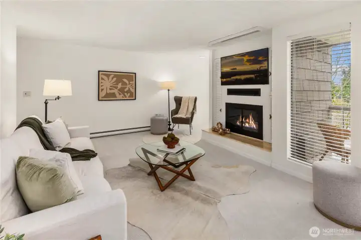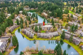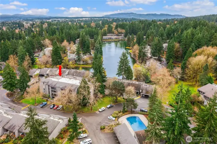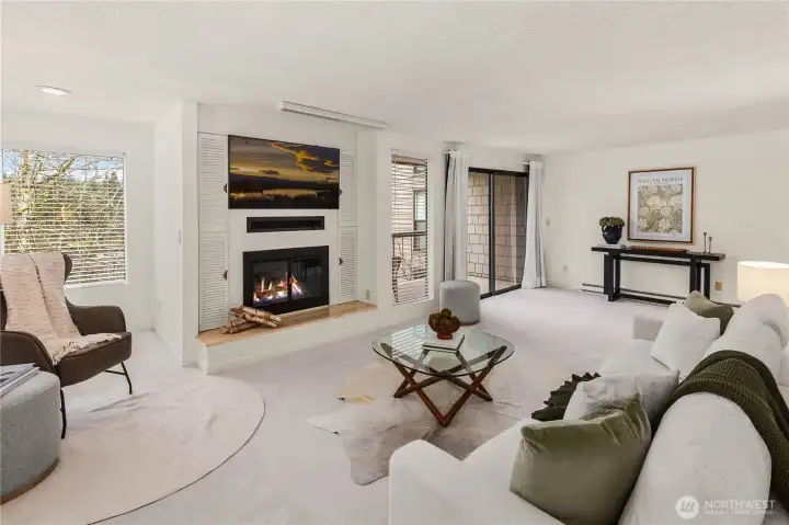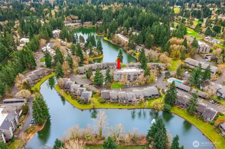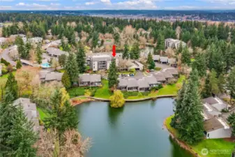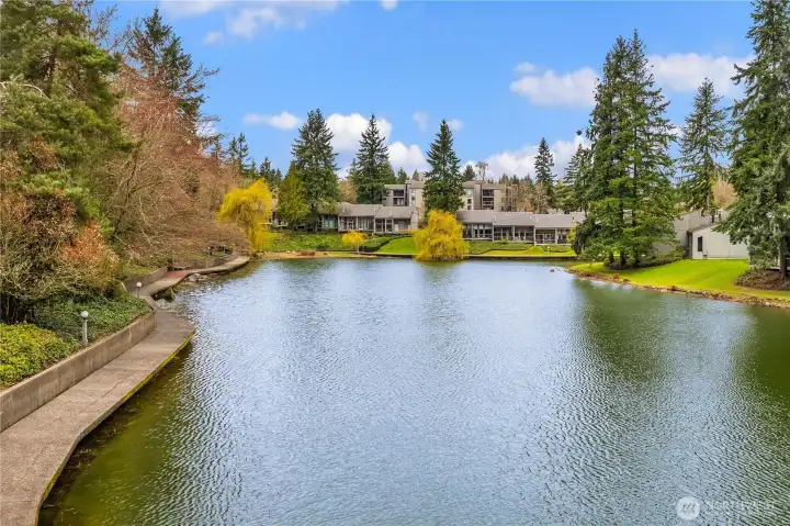 Welcome to the highly sought-after Sixty-01 Village! This bright 3rd floor end-unit condo features 4 private balconies, elevator access, and beautiful lake views from the living room. Freshly painted with new carpet, this home offers an updated kitchen with granite countertops, stainless steel appliances, a spacious living room with wood-burning fireplace, and large windows that bring in abundant natural light. The layout includes 3 spacious bedrooms, providing flexibility for working from home, guests, or hobbies. Additional features include updated bathrooms with granite counters, walk-in closet, storage, unit, and 2 reserved garage parking spaces, plus ample guest parking. Set within 86 acres of beautifully maintained grounds, Sixty-01 Village offers resort style amenities including 4 swimming pools, lakes, fitness center, sauna, tennis, pickleball and racquetball courts, volleyball, clubhouse, BBQ areas, and scenic trails connecting to Microsoft, Marymoor Park, and Bridle Trails Park. Located across from Bellevue Golf Course and under a mile to Bridle Trails Shopping Center, with easy access to Downtown Redmond, Kirkland, Bellevue, I-405, and SR-520. Top-rated Lake Washington School District. No rental cap.