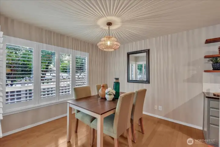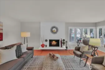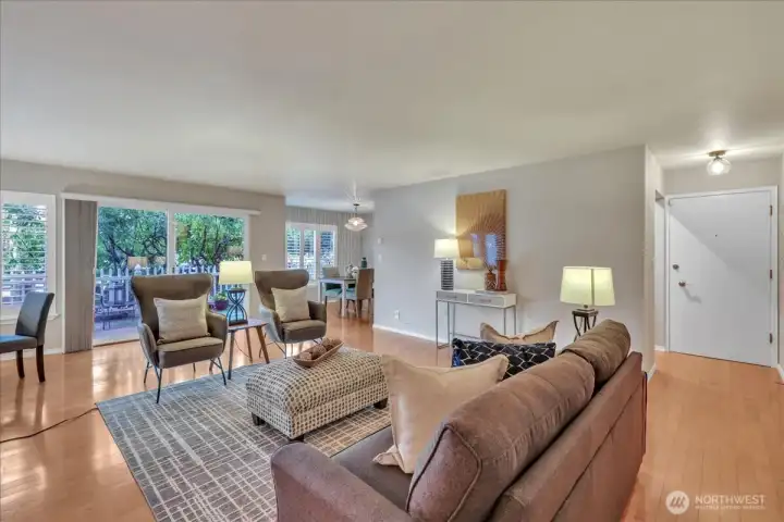 Ideal Bryant location — minutes to Burke-Gilman trail, Met Market, Magnuson Park, U Village, UW, brewpubs, you name it! Bright corner 2BR/2BA unit with gleaming hardwood floors throughout. Spacious great room opens to full-size dining area and kitchen, creating a perfect circular entertainment flow. Living area features a wood-burning fireplace and sliders from both living and dining rooms to a large, covered private patio. Primary ensuite offers ample closet space; both bedrooms are tucked away for privacy. Small boutique building in excellent condition. Convenient reserved parking spot right by the building front door. Great single family home alternative in a popular neighborhood with so much to offer. Dogs and cats welcome! There is nothing to do here but move in and enjoy.