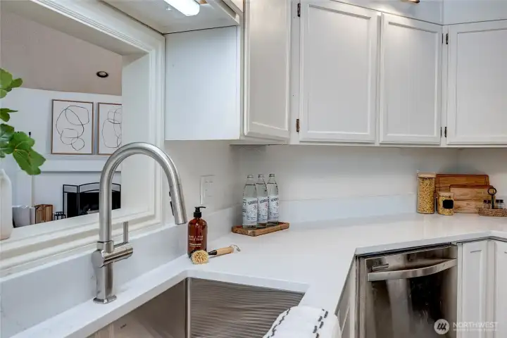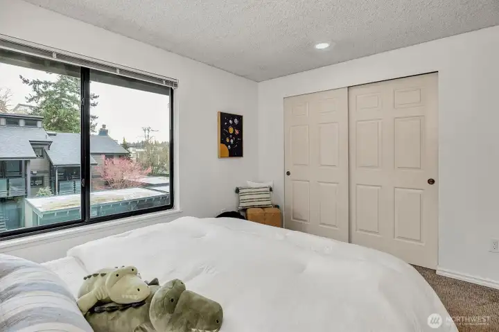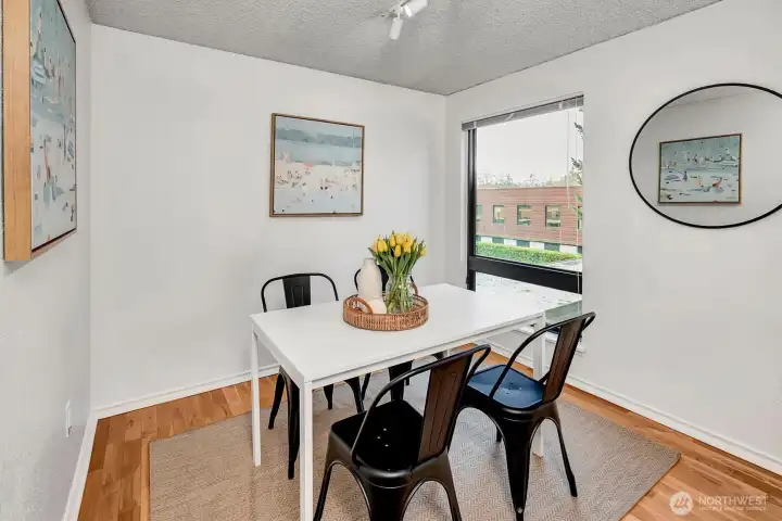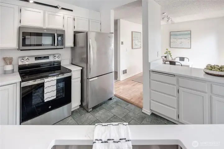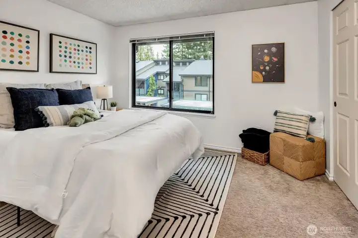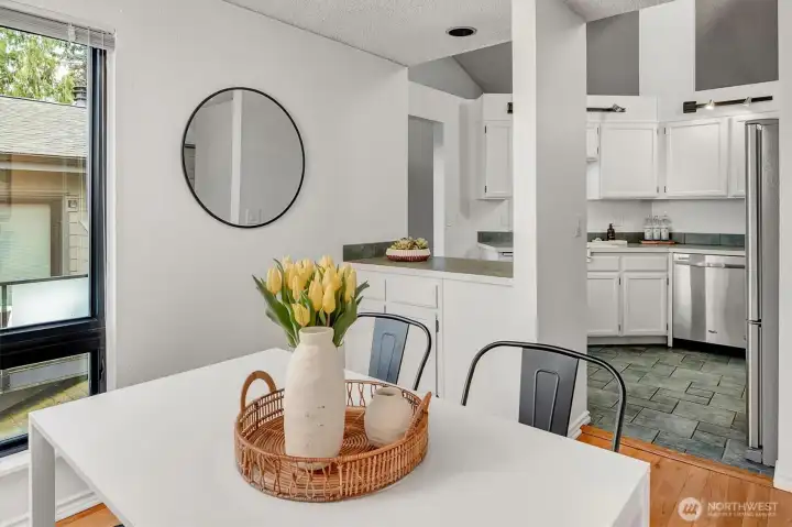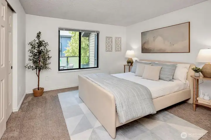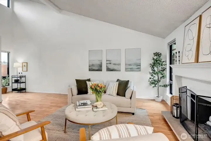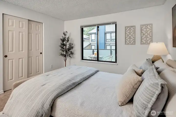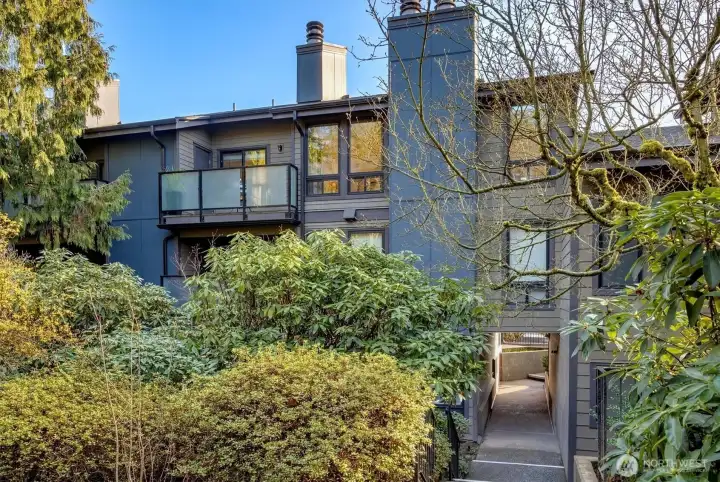 Top-floor penthouse condo featuring 2 bedrooms and 2 bathrooms with a significantly larger floor plan than most units in the community, offering an expansive, light-filled layout. Vaulted ceilings and oversized windows create an airy, open feel, complemented by beautiful southern exposure.The updated kitchen boasts new countertops and appliances, while fresh paint throughout adds a clean, modern touch. The spacious living room includes a cozy fireplace, and hardwood floors run throughout the main living areas. Step outside to a private patio overlooking serene garden views. Additional highlights include full-size in-unit laundry and a versatile flex space ideal for a dining area or home office.The thoughtfully designed floor plan offers excellent privacy, with bedrooms separated and bathrooms positioned between them. No rental cap makes this a strong investment opportunity. Located in the Park Meridian community, this home offers an unbeatable location near light rail access, Northgate shopping, dining, and everyday conveniences.