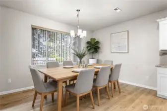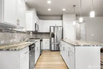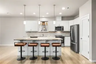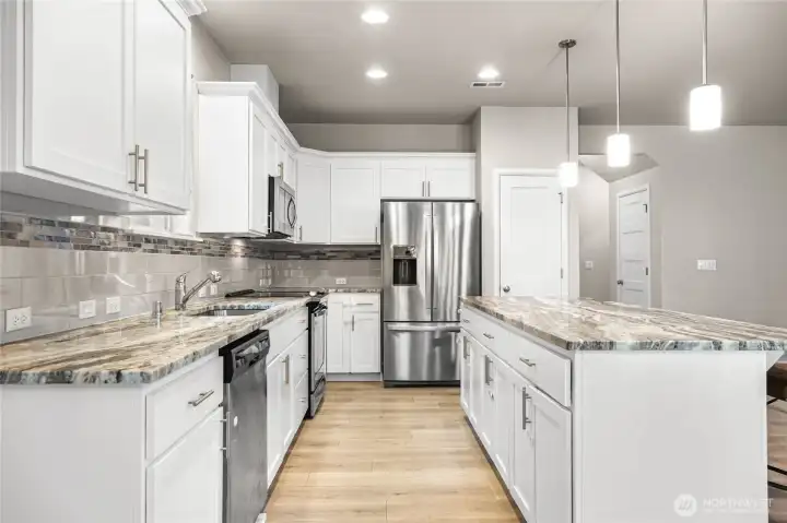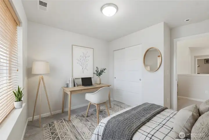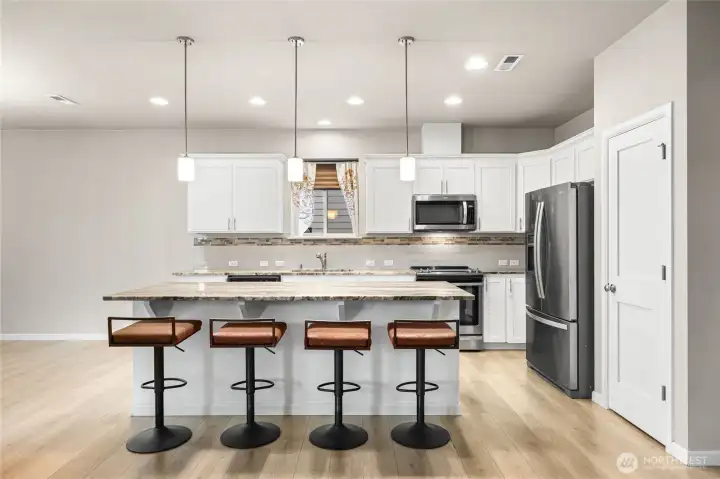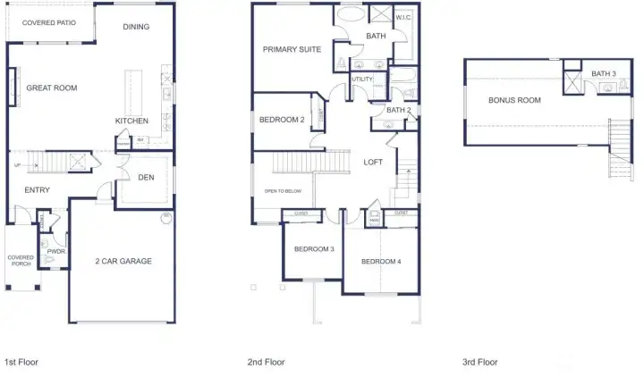 Welcome home to this beautifully designed Willow floor plan in the sought-after Sierra Vista community, offering 4 bedrooms, 3.25 baths, and 2,928 square feet of well-appointed living space across three levels. A dramatic high-ceiling entry welcomes you into the main floor, featuring a den with French doors—ideal for a home office or flex space. The modern kitchen showcases stainless steel appliances, quartz countertops, and a spacious island that opens to the great room with fireplace and adjacent dining area, creating a seamless layout for everyday living and entertaining. Step outside to the covered patio overlooking the fully fenced yard, perfect for year-round outdoor enjoyment. Energy-efficient systems and a tankless water heater provide added comfort and convenience. Upstairs, the primary suite offers a luxurious five-piece ensuite bath and a generous walk-in closet, along with three additional bedrooms and convenient access to the laundry area. The third floor provides a versatile bonus room that can function as a second primary suite, guest retreat, media room, or additional flex space—ideal for multi-generational living. Conveniently located near parks, schools, and JBLM, this home offers a perfect balance of comfort, functionality, and location.