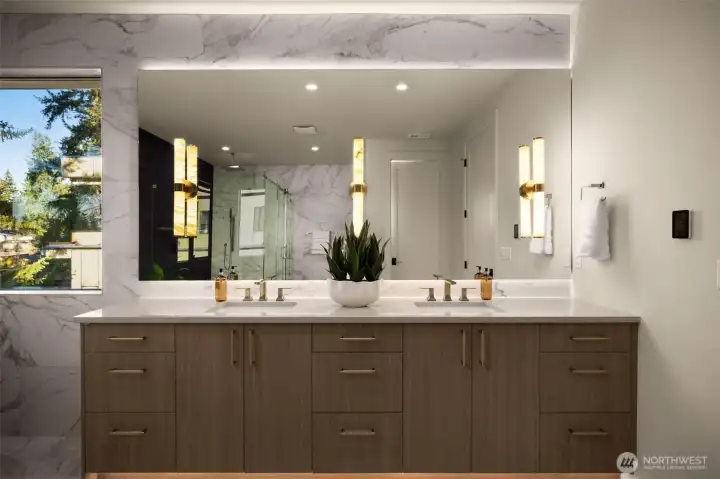 Experience luxury living in this newly completed Northwest Contemporary home by Belle Crown Homes, ideally located on a large, private lot within the boundaries of award-winning Newport High School. Thoughtfully designed with high-end finishes and modern smart features, this home offers an open, light-filled floor plan perfect for both everyday living and entertaining. The main level includes a private guest suite, a chef’s kitchen with custom wood cabinetry, dual dishwashers, and a dramatic two-story great room. Covered outdoor living includes Sonos built-in speakers, electric heaters, and custom decking, all overlooking a spacious backyard. Luxurious primary suite features a stunning spa like bath, perfect for relaxation. Additional highlights include heated tile floors, Brizo Litze instant hot water, and carefully selected designer fixtures throughout. Sustainable features such as solar panels, dual heat pumps, and spray foam insulation enhance efficiency, while the expansive four-car garage with epoxy floors and finished walls provides abundant space for vehicles, storage, or hobbies. Conveniently located near Bellevue parks, shopping, trails, and amenities, this exceptional home blends sophistication, comfort, and modern functionality.
