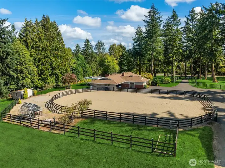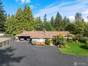 Presco Farm, first time available in 30 years, this exceptional equestrian estate sits on nearly 10 pristine acres in an area of distinguished properties. Comprised of three tax parcels, the setting offers privacy and beauty, featuring a paved, gated, tree-lined drive and four-rail fenced pastures. The thoughtfully updated single-level home showcases a spacious great room design, an open kitchen, four bedrooms, and two fireplaces. Enjoy year-round entertaining with a covered outdoor living area complete with a full kitchen and slab countertops. The fully fenced backyard is perfect for relaxation, offering a hot tub and firepit. Additional features include two covered parking spaces and an expansive four-bay shop with a car lift and a full upper-level storage area. Equestrian amenities abound with a seven-stall barn, outdoor arena, paddocks, and multiple fenced pastures—providing ample space to ride, roam, and enjoy this truly one-of-a-kind estate.