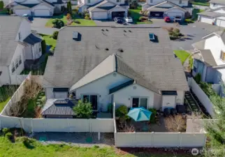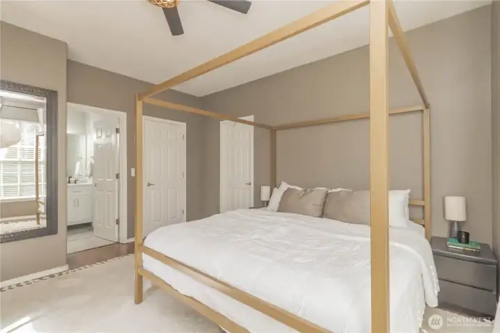 Thoughtfully updated Brentwood home tucked into a quiet cul-de-sac community of just 44 residences. This well-designed layout features a main-level primary suite, vaulted ceilings, and an open-concept living and dining area filled with natural light. Enjoy a cozy gas fireplace and engineered hardwood flooring throughout the main living spaces. The kitchen offers stainless steel appliances, breakfast bar seating, under-cabinet lighting, and abundant counter space—perfect for everyday living and entertaining. A beautifully updated powder room and convenient main-level living add to the home’s functionality. The spacious primary suite includes a walk-in closet, double vanity, and custom tile walk-in shower. Upstairs, you’ll find two additional bedrooms, a shared full bath, and a flexible office or bonus space. Step outside to a private patio with hot tub, mature landscaping, fruit trees, and direct access to expansive community green space. HOA covers exterior maintenance, landscaping, water, and septic. Located in the desirable Brentwood community near shopping, dining, and commuter routes.