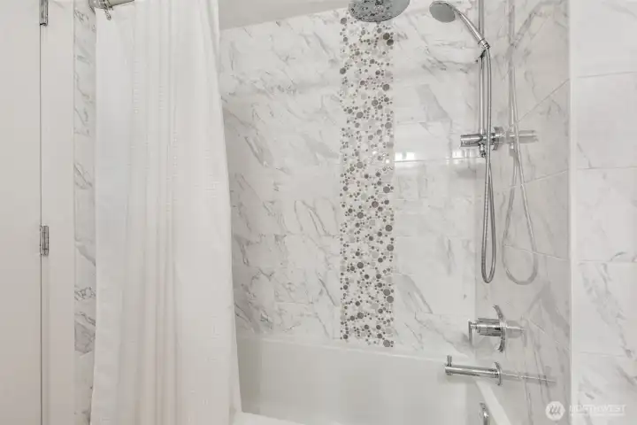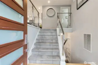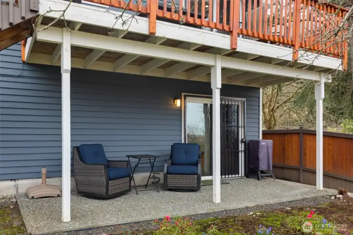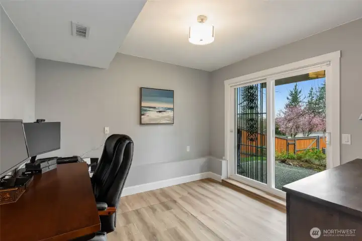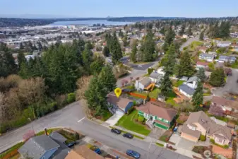Immaculate split-level on a corner lot in a stellar location. Just minutes from I-405 and The Landing, this home offers easy access to everything—yet lives quietly tucked away from it all. Meticulously maintained inside and out, it delivers effortless living with thoughtful updates throughout. Light-filled great room style living spaces center around a welcoming living room with fireplace. An expansive, fully equipped kitchen with generous island flows seamlessly to the dining area and out to a spacious deck—ideal for summer entertaining—with filtered northwest-facing lake views beyond. Three bedrooms on the main level feature excellent closet space with built-in systems.En-suite primary with luxe bathroom, showcasing extensive tile work. Downstairs, impressive ceiling height elevates the rec room with a second fireplace, while a versatile flex space with patio access easily serves as a home office, guest room, or fourth bedroom. A three-quarter bath and utility room add function. Oversized attached two-car garage with shop area. Level, fully fenced backyard with low-maintenance landscaping, shed, and gated access with room for RV parking. Central A/C and smart features throughout. Move-in ready and perfectly dialed for everyday living.