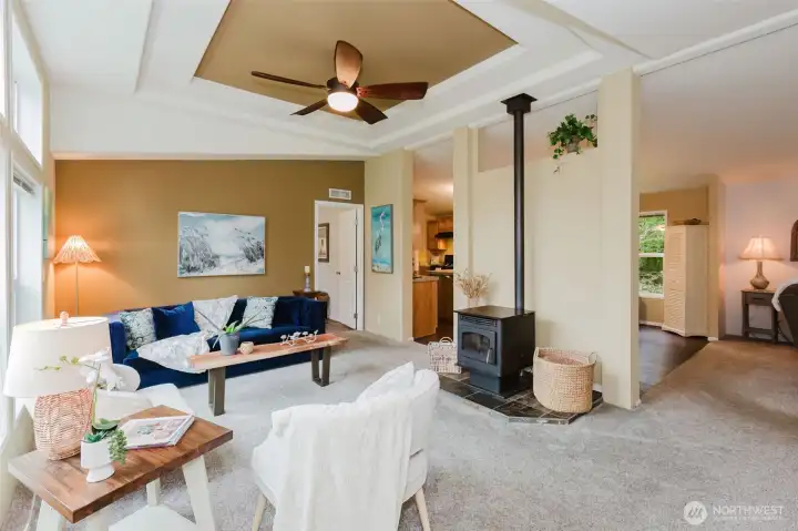 Welcome to “Lucky” Space #1 at Kitsap West Mobile Home Community—quite possibly the nicest home in the neighborhood! This beautifully updated 4-bedroom, 2-bath home offers over 1,800 square feet of spacious living with an open-concept layout and soaring decorative ceilings that create an airy, inviting feel. The home has been thoughtfully refreshed with all-new flooring, trim, and interior paint, giving it a clean, modern look throughout. Cozy up by the wood stove in the main living area or turn on the A/C, perfect for those PNW temperatures. The expansive primary suite is a true retreat, featuring a large walk-in closet and a newly updated vanity. The primary bathroom is plumbed for a tub, offering the opportunity to easily convert it into a full second bath. All appliances stay, and a separate laundry room adds everyday convenience The three additional bedrooms are generously sized and each features large walk-in closets—rare and highly desirable! Enjoy added privacy as the home backs up to a peaceful greenbelt—bring your binoculars for bird watching in this private natural setting. Outside, you’ll find a convenient 2-car carport and a nice storage shed, providing ample space for parking and storage. Ideally located with easy access to Highway 16, this home is just 15 minutes to Puget Sound Naval Shipyard and the Southworth/Seattle ferry—making commuting a breeze. Don’t miss your opportunity to own this standout home—Lucky #1 is ready to welcome you home!