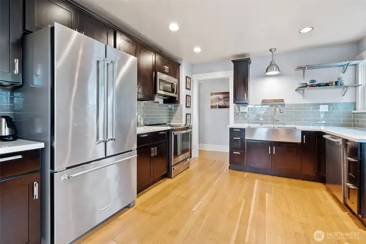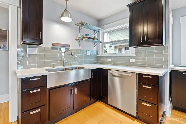 Beautifully reimagined Craftsman with captivating views in the heart of North Tacoma. Thoughtfully updated with major infrastructure improvements including plumbing, electrical, furnace, water heater, roof, and more—offering a truly move-in ready experience. Rich hardwoods grace the main level, complemented by softwood floors above. The chef’s kitchen features quartz countertops, custom cabinetry, stainless appliances. Updated baths, designer lighting, and curated finishes create a cohesive, elevated aesthetic throughout. The spacious primary suite on the main includes a beautifully updated bath with soaking tub and separate shower. Upstairs offers generous bedrooms and a light-filled office with views. The 1,440 sq ft finished basement provides exceptional flexibility with a large bonus space. Outdoor spaces are equally inviting with new concrete front steps, patio, sprinkler system, and convenient alley access to a garage and covered carport. Additional upgrades include new HardiePlank siding, windows, and central A/C. Ideally located near Proctor, Old Town, dining, and easy I-5/705 access—this is classic Tacoma charm, thoughtfully modernized.