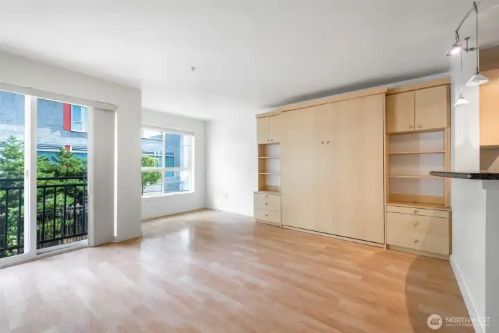 City living made simple—and surprisingly spacious. This thoughtfully designed downtown studio invites you to settle in and make it your own, with a queen Murphy bed, built-in bookcases, and flexible living space that shifts effortlessly from workday to evening unwind. The kitchen is both functional and stylish with stone counters, GE appliances, and contemporary lighting, while a tucked-away nook offers the perfect place to read, work, or recharge. A Juliet balcony brings in light and fresh air, complemented by a California walk-in closet, full bath, and in-unit laundry. Enjoy the shared outdoor terrace and gathering spaces, then step out and explore—just moments to the waterfront, stadiums, International District, and multiple transit options. With no rental cap, this is a place to live, invest, or simply enjoy the best of Seattle.