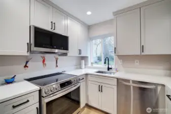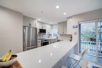 Welcome to Miller Place - a boutique building in the heart of Capitol Hill, on a peaceful, tree-line street just steps from Miller Park, light rail and vibrant shops and eateries. Coveted top floor corner unit with 800 square feet - this one-bedroom unit lives large. The updated kitchen is more like something you usually only find in a home - tons of counter space, cabinets, stainless steel appliances and quartz countertops. The spacious primary suite includes two closets and an ensuite with double sinks, separate tub and shower. In-unit full-size side-by-side washer and dryer adds everyday convenience. Enjoy TWO private outdoor spaces, secure parking and storage, in a pet-friendly building. An ideal location with or without a car, offering easy access to downtown, South Lake Union, hospitals, transit, and freeways. This is a rare in-city retreat.