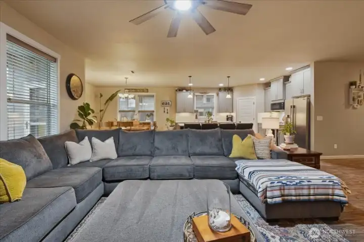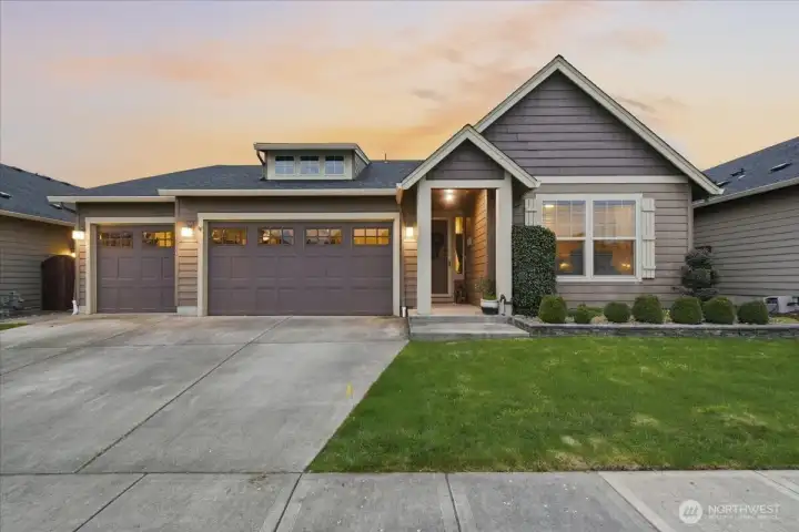 This is the kind of main-level living that homeowner dreams are made of. A 3-car garage, a split-bedroom floorplan & a covered patio...this contemporary 3-bed, 2-full-bath home is a true stand-out! 2024 sqft feel even more spacious with high ceilings & an impressive great room design. The main living area is open & versatile. You’ll be able to cozy up in front of the gas fireplace, or be the life of the party after cooking up a storm in the roomy kitchen. In the kitchen, you’ll find lovely quartz counters—much of which are showcased on the sprawling central island that features an eating bar & extra storage. With the pantry, all the cabinets & drawers, all your kitchen gadgets, pots & pans will have places to go! The dining area is large enough for full on entertaining, draws in natural light & flows through a full glass swing door to the covered patio. The living room views to the patio & backyard & centers around the gas fireplace. The primary bedroom is a private suite w/ a walk-in closet & ensuite bathroom including a walk-in shower & a tub. The laundry room boasts a sink, cabinets & hanging bar. Out back, the covered patio is plumbed to connect your gas grill...so no more trips to exchange those empty tanks! The backyard is fully fenced, low maintenance & lined by arborvitae for privacy. Sprinklers & drip lines run throughout the landscaping front & back. All appliances stay & you’ll want to stay, too & be able to call this one home after you take a tour!