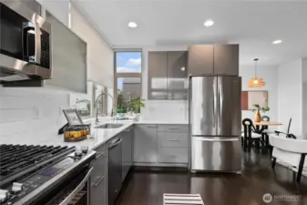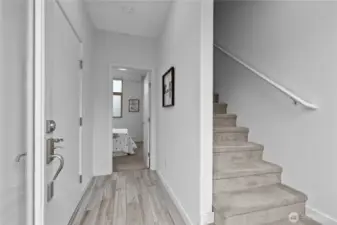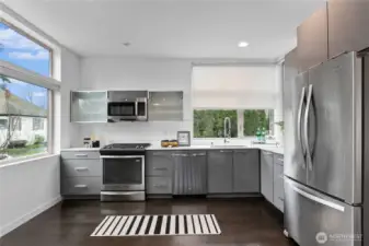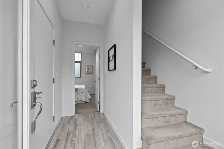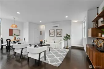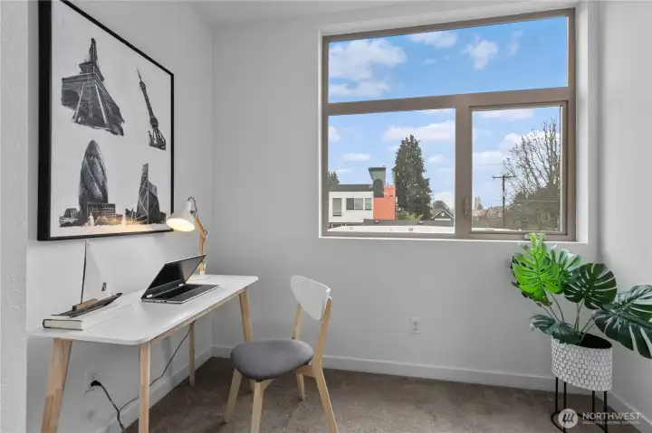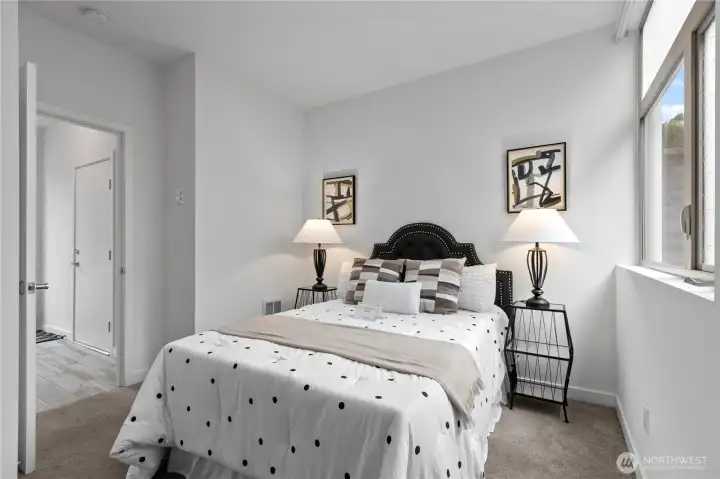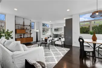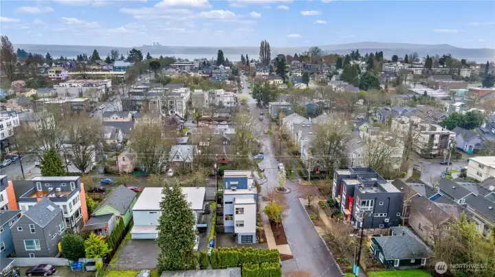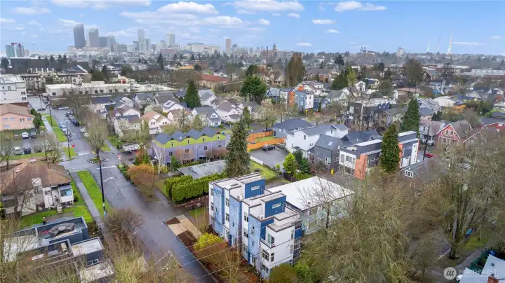Stylish in-city living in the heart of the Central District. This rare 2015 end-unit townhome offers nearly 1,400 sq ft on a quiet, tree-lined street. An excellent opportunity for investors or owner-occupants, the versatile layout and prime location offer great short-term rental income potential. Thoughtfully designed with 2 bedrooms, including a flexible lower-level space—perfect for a guest room, office, or den—with access to a private patio. The top-floor primary suite features a spacious en suite bath, creating a comfortable retreat. The open-concept main level provides generous living and dining space, complemented by a powder room and oversized windows that bring in abundant natural light. Enjoy city and Mount Rainier views, along with fresh interior paint for a clean, move-in ready feel. Additional highlights include an attached garage, ample street parking, and a private rooftop deck with gas hookup—ideal for entertaining. Walk Score of 90 offers easy access to shops, dining, and parks.