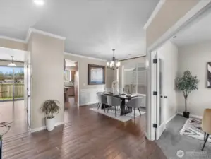 Beautifully maintained home with a versatile and inviting layout in the highly sought-after Falling Waters community. The main level features a private office with elegant French doors, a formal dining room, and a warm, welcoming living room with a cozy gas fireplace. The kitchen is a chef’s delight with granite slab countertops, stainless steel appliances including a gas stove, and a spacious pantry. Rich hardwood flooring flows throughout, complemented by brand new carpet. Upstairs, you’ll find four generously sized bedrooms, two full baths, and an expansive bonus room. Enter the primary suite through French doors, offering a large walk-in closet and a luxurious 5-piece bath. Step outside through the slider to a fully fenced backyard with no homes behind, providing added privacy. Ideally situated on a quiet cul-de-sac in a vibrant community known for year-round activities!