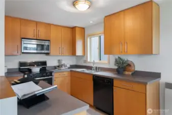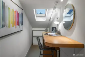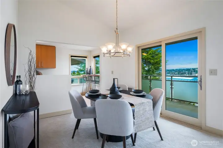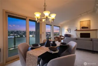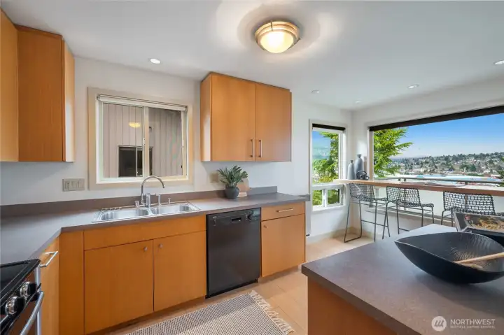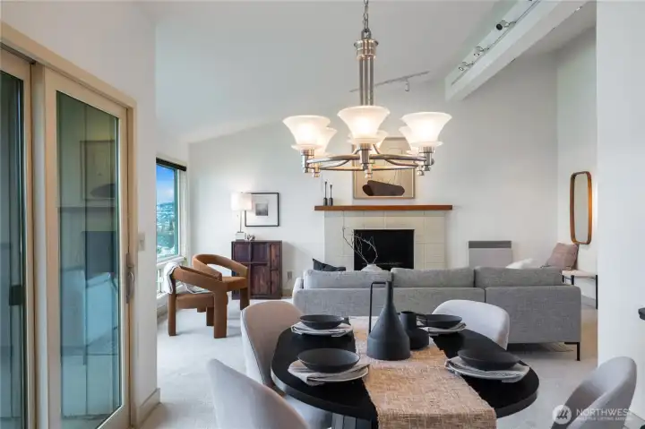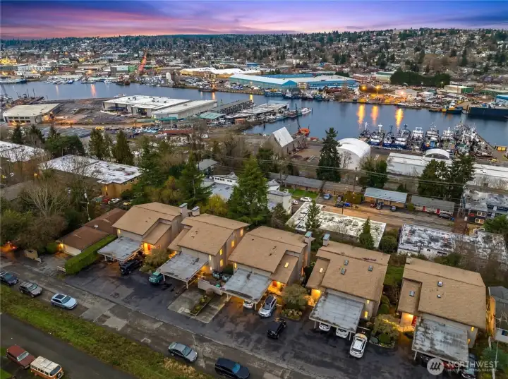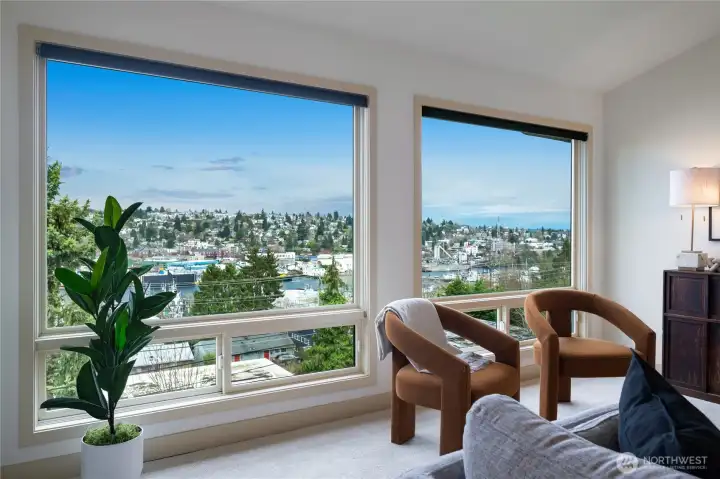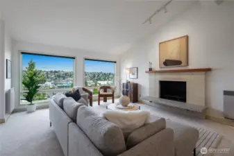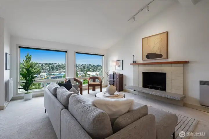 What a cool condo! From the front door walk up a flight of stairs to an everchanging view of the ship canal and Fremont, with majestic mountains in the backdrop. Large picture windows frame the view and flood the home with natural light even on cloudy days. The vaulted ceilings add drama and enhance the already large floor plan. Plus the over-scaled fireplace adds more drama. The kitchen with Bosch appliances, wood cabinets and a breakfast bar is the perfect place to start and end your day. The Primary bedroom with vaulted ceilings and concealed lighting make it special. The walk-in closet leads to a private bath with special design details. Surprise; a closet in the hall has been converted to an office with a skylight to provide lots of natural light. Two parking spaces plus guest parking is a delight. Additional storage is also a plus. Want to go out? The top of Queen Anne, Ballard, or Fremont are all close by. Come see this delightful condo!