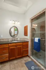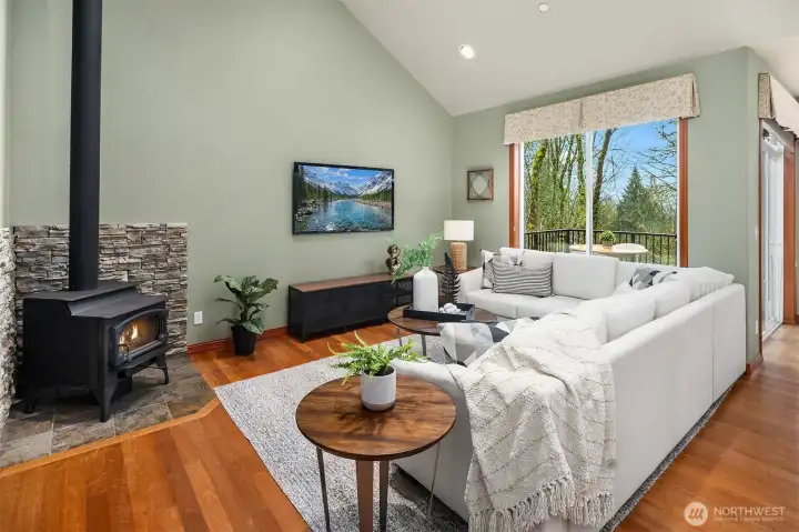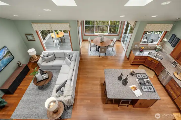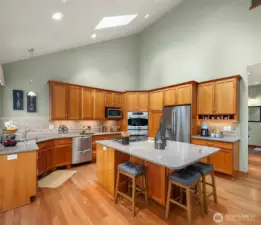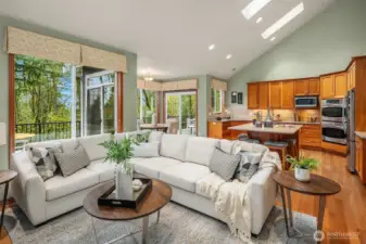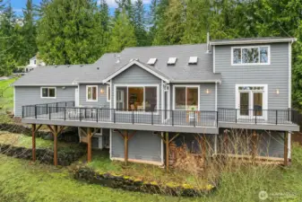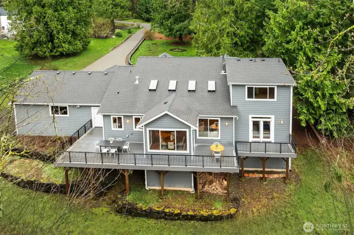 Lovingly maintained by the original owners, this custom-built 2007 Thornburg home offers 2,764 sq ft of thoughtfully designed living on a peaceful 1.1-acre (46,784 sq ft) lot in the sought-after High Valley community. Surrounded by natural beauty, the setting feels private and serene. The main level is designed for comfort and accessibility with zero-step entry from both the front door and garage, a main-floor primary suite, dedicated office, laundry, and guest bath with walk-in shower. Wide hallways and doorways create an easy, open flow throughout the home. The kitchen is highly functional with soft-close drawers, pull-out shelving behind every cabinet door, and pull-out pantry storage. Quality features include cherry and alder cabinetry, quartz countertops, refinished Moabi hardwood floors (2024), heated floors in the primary bath, skylights, central A/C, and a back-up generator powering essential systems. Outstanding storage includes approximately 600 sq ft of full-height unfinished crawlspace with concrete slab, windows, and exterior access—ideal for storage or future office, gym, or hobby space—plus 300 sq ft of walk-in attic storage above the garage. Outdoor living includes a full-length deck, stone patios, rockeries, and curated landscape lighting. High Valley amenities include an extensive trail system with private access to Squak Mountain State Park, community stables, and a neighborhood park with tennis, pickleball, basketball, playground, and picnic areas.