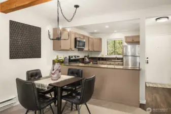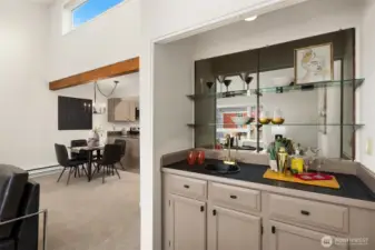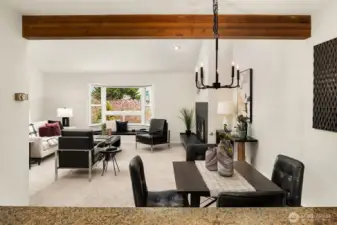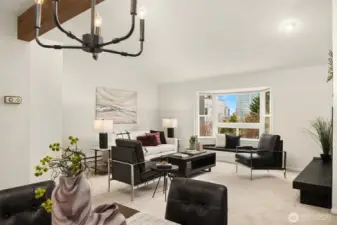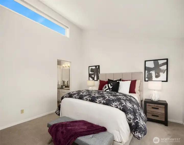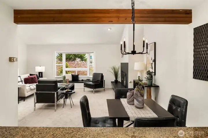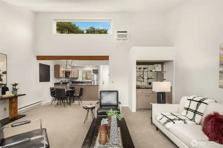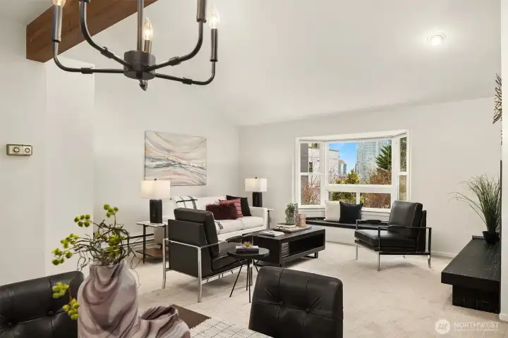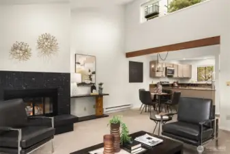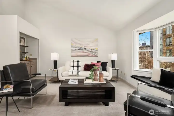 Dazzling Capitol Hill Stunner ~ Just steps from Broadway, this top-floor designer jewel box in sought-after Versailles is where vibrant urban living meets modern sophisticated style. Perched above the city in a quaint 21-unit enclave with secure garage & elevator, you'll fall in love with the expansive light-filled open floor plan, dramatic soaring vaulted ceilings, panoramic clerestory windows & sparkling downtown skyline views. Move-in ready & loaded with new upgrades: rich LVP floors, gorgeous pattern carpet, luxurious high-end tile, upscale curated lighting + white millwork, black hardware, fresh paint, new A/C & more. Covered outdoor entry overlooking wooded courtyard opens to welcoming private foyer. Spacious kitchen with solid oak painted cabinets, stainless steel appliances & slab granite counters opens to dining space & huge living room with tiled fireplace, sweeping hearth, bay window with bench seating & retro wet bar alcove. Opulent hall bath with oversized soaking tub, big skylight & bold tile surround. Vaulted ceilings carry through to the primary suite with tall windows, walk-in closet, rare granite vanity & custom tile shower. Guest bedroom/office + full-size laundry & extra storage locker. Enjoy the epicenter of Seattle culture with shops, dining, nightlife & light rail at your door!