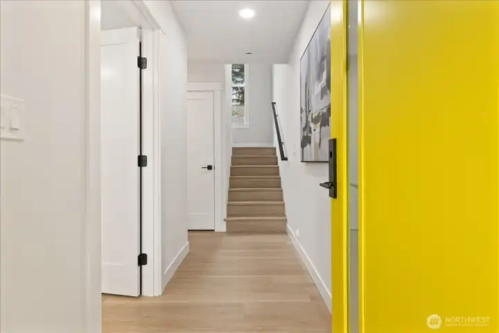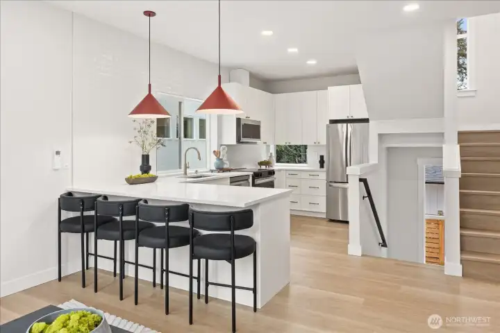 Discover refined modern living in this stunning new construction two bedroom home in North Seattle. Thoughtfully designed with clean lines and abundant natural light, the open-concept main level flows seamlessly from a stylish living area to a chef’s kitchen featuring sleek quartz countertops, stainless steel appliances, and a generous island perfect for entertaining. Custom touches, including a show-stopping accent wall in the living area, and warm wood tones add depth and character throughout. Retreat to the luxurious primary suite, where soaring vaulted ceilings create an airy ambiance, complemented by a spa-inspired en suite bath designed for relaxation. A lower level bedroom and bonus room provide plenty of options for the buyer's needs. Enjoy year-round climate control with energy-efficient heating and cooling. Dedicated parking included.