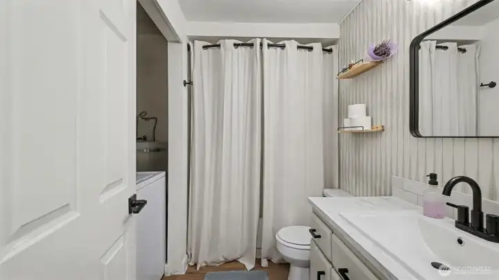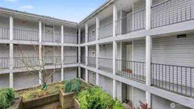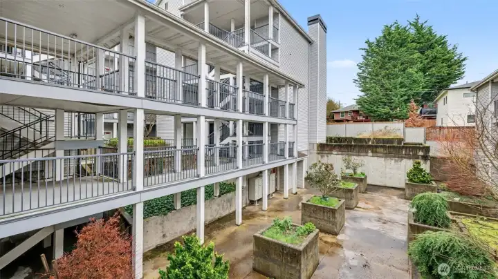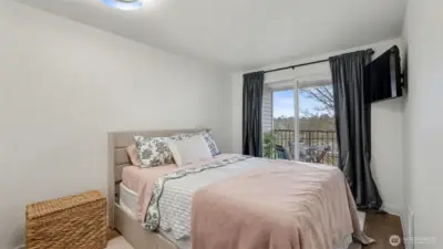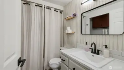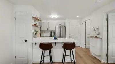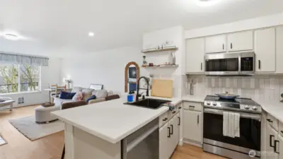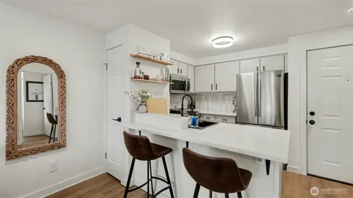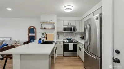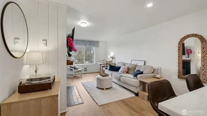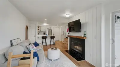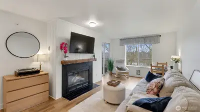 Completely remodeled and full of charm, this 1-bedroom, 1-bath condo offers stylish living in a prime location. The updated kitchen features quartz countertops, stainless steel appliances, and a sleek tile backsplash, complemented by new luxury vinyl plank flooring and fresh paint throughout. The living room is highlighted by a cozy fireplace with beadboard detail, adding warmth and character. The spacious bathroom includes a full-size washer and dryer plus extra storage. Enjoy a generous patio with access from both the bedroom and living room—perfect for relaxing while taking in natural light and western views of the Olympic Mountains and sunsets. This pet-friendly building offers gated entry, a parking space, elevator access, and is conveniently located near shopping, dining, and everyday amenities.