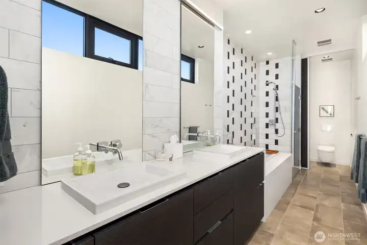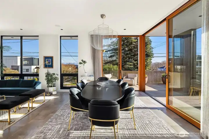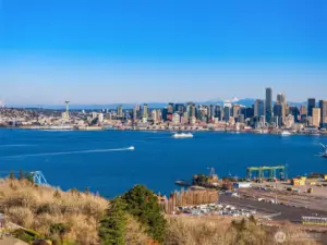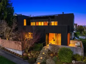 Progressive modernism. Subtly luxurious, technically innovative custom urban home by award winning Patano Studio. Commanding views of Mt Rainier, Seattle Skyline, bay & the Olympic mountains. Featuring an innovative solar array, passive cooling, advanced thermal envelope for near-zero energy. Airy indoor & outdoor living, with gracious patios, fenced backyard and a 700 sf rooftop deck. Entertainers dream kitchen, main level guest suite, gracious main living spaces. Upper level features 2 guest rooms, rooftop deck & incredible primary with spa-like ensuite bath, private laundry, innovative closet & flex office. Lower level is a flex space, with ADU potential, bedroom/living spaces & bath. 2 car garage with EV charger & fully fenced backyard. Previously featured in Dwell magazine.
