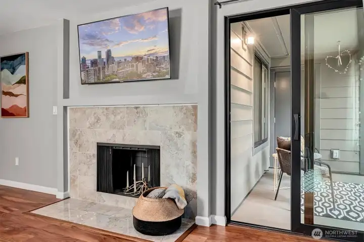 Welcome to Park Meridian. You'll love this turn-key, 2-bedroom, 1.75-bath condominium. Updates throughout, including new engineered hardwoods, remodeled bathrooms, new tile fireplace surround, updated kitchen and more. The 2022 building remodel included cement-board siding, new roof and new windows. Light and bright kitchen with a passthrough to the continuous dining and living rooms. Cozy wood-burning fireplace, picture windows which frame the outside greenery. Private deck for summer relaxation. Primary bedroom with ensuite bath. Custom heated tile flooring and tile surround, plus dual sinks with marble countertops. The second bedroom is roomy, and the 2nd bath includes a soaking tub, tile surround and new countertops. Park Meridian is pet friendly and there is no rental cap. 1 assigned carport parking spot plus ample guest parking. Great location, with proximity to the light rail, I5, 99, Northgate and the Kraken Iceplex. Nearby restaurants, shops and parks make this a great location to live.