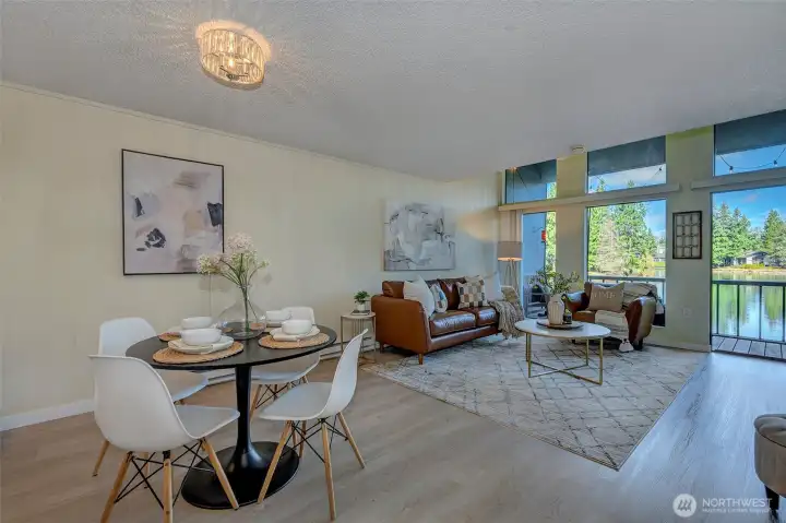 Stunning remodeled lakefront townhome offering modern style and serene waterfront living. Light-filled interior with new luxury plank flooring, plush carpet, updated lighting, and a wall of windows showcasing beautiful lake views. Well-appointed kitchen features stainless steel appliances, large pantry, sleek cabinetry, quartz countertops, and seating bar. Updated baths include new vanities and refreshed tile. Enjoy the spacious view deck, your private retreat for morning coffee or evening sunsets. Vaulted primary suite with high windows; versatile second bedroom ideal for guests or office. Dedicated parking and in-unit laundry. Enjoy resort style amenities including pools, tennis courts, clubhouse, lakes, and walking trials. Minutes to Microsoft, downtown Redmond, shopping, dining, and top-rated Lake Washington schools. Ideal blend of comfort, convenience, and community living. Strong HOA, abundant guest parking and no special assessments. Experience lake front living at it’s finest.
