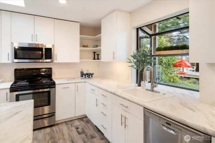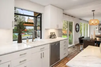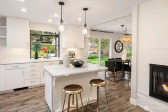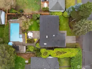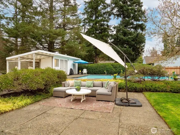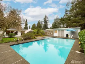 Experience the ultimate in mid-century modern ease in this updated 1956 rambler. Designed for seamless flow, the layout features an open floor plan with two fireplaces that anchor the kitchen, dining, and living areas. This bright, airy heart of the home is bathed in natural light through stunning floor-to-ceiling windows. The thoughtful layout places the bedrooms on a dedicated wing for maximum privacy. The spacious primary en-suite boasts a large picture window, walk-in closet and updated full bathroom. With the two additional bedrooms sharing a centrally located bathroom. Step outside into a professionally landscaped oasis. This level, private retreat is centered around a sparkling in-ground pool and jacuzzi. A stylish cabana with 3/4 bath provides a versatile space for poolside entertaining or quiet unwinding. Tucked away on a tranquil street, yet minutes from I-5 and the Light Rail. This home perfectly balances calm neighborhood with effortless urban connectivity.