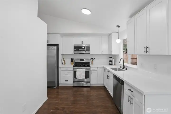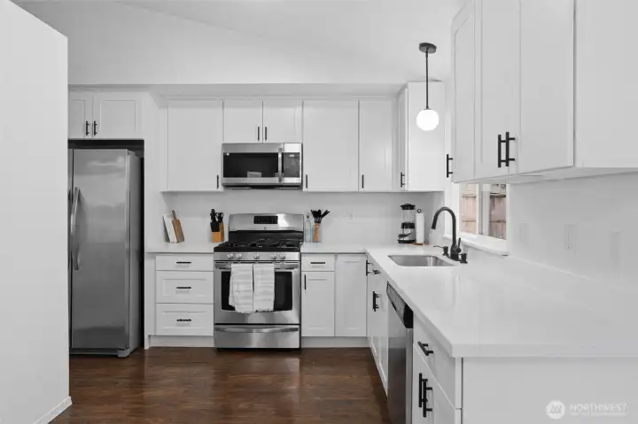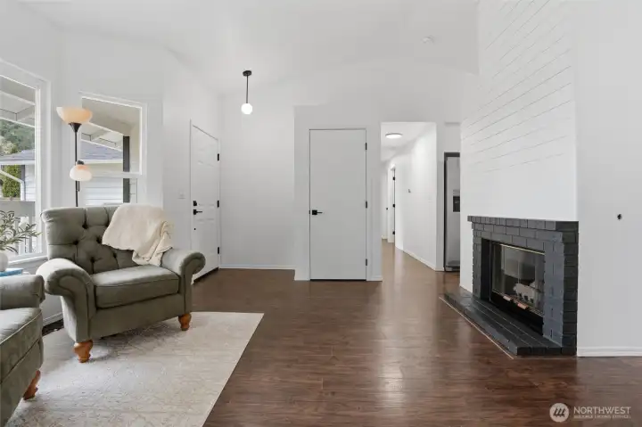 Fully remodeled and move-in ready rambler, this beautifully updated Port Orchard home offers the perfect blend of style, comfort, and peace of mind. Step inside to vaulted ceilings, abundant natural light, and a bright, open layout. The living area features a striking fireplace and flows seamlessly into the dining space and kitchen—ideal for everyday living and entertaining. The kitchen has been redesigned with new shaker cabinets, quartz countertops, and a clean, modern feel. Just off the dining area, a sliding door opens to a freshly updated deck and private backyard—perfect for relaxing or hosting. Major upgrades include a new roof, fresh interior and exterior paint, updated lighting, new bathroom vanities, and new carpet in the bedrooms. The existing luxury vinyl plank flooring is in excellent condition, offering durability throughout the main living areas. Situated on a quiet street with a usable yard, mature trees, and fresh landscaping, this home offers both privacy and curb appeal. Conveniently located near schools, shopping, and commuting routes. Homes with this level of updates and value rarely come available—schedule your showing today.