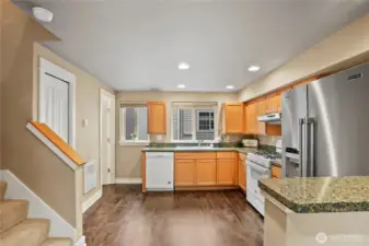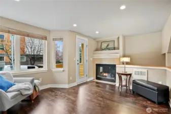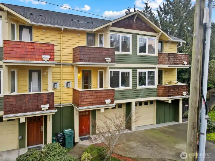 Turn-key Green Lake townhome just two blocks from the lake. The open-concept main level features refinished hardwoods, a kitchen with granite countertops and a gas range, dining area, and a living room with a gas fireplace—plus a balcony for morning coffee, BBQ, or evening unwinding. Convenient main floor powder bath. Upstairs offers two bedrooms with vaulted ceilings, each with its own ensuite bath, plus a private balcony off the primary bedroom. Fenced back patio. Massive 1.5-car garage with exceptional storage. Pre-inspected with maintenance completed for peace of mind. Enjoy easy access to shops, dining, light rail, and downtown. No HOA.