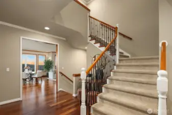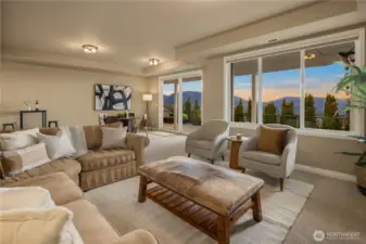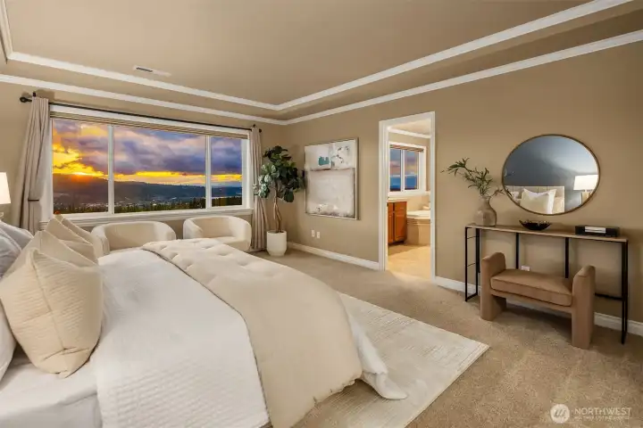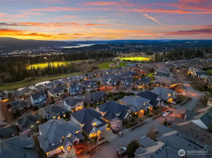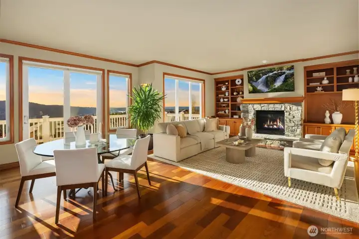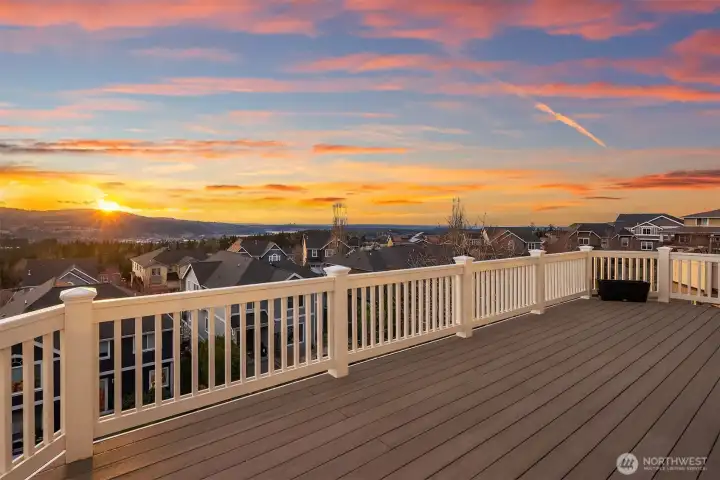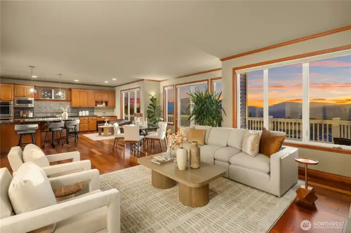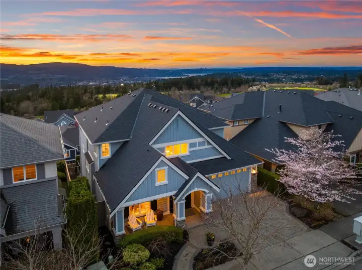 Perched at the pinnacle of the Issaquah Highlands, this stunning William Buchan residence offers breathtaking, panoramic views of the mountains, city skyline, and lake. Meticulously cared for by its original owner, the home’s pride of ownership is evident in every detail. The highly desirable floor plan features a spacious main-level den with French doors, while the upper level hosts four generous bedrooms, including a grand primary suite positioned to capture westerly sunset views. One of the spacious upper bedrooms functions as a junior suite, complete with its own private full bath. The heart of the home is the expansive great room, which opens to a large deck—the perfect vantage point for taking in the glorious scenery. Additional living space abounds on the lower level, featuring a full guest quarters suite and a bonus room that leads to a completely reimagined patio. With a brand-new roof, furnace, water heater, and central A/C, this home offers true peace of mind. Located just moments from parks, trails, and top-rated Issaquah schools including Grand Ridge Elementary, this is a rare opportunity to own one of the premier view estates in the Highlands.