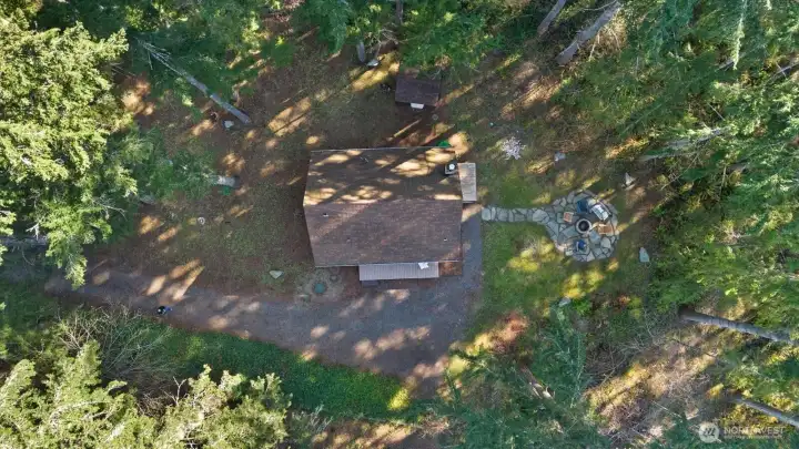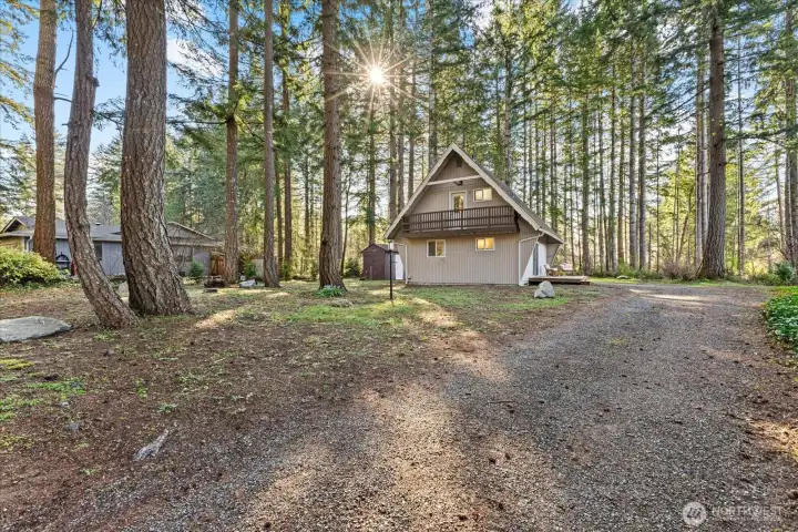 Tucked beneath a canopy of evergreens in the gated Lake Holiday community, this charming chalet feels like a storybook escape. You will be absolutely shocked as it feels much larger than its 900 sq ft - featuring 1 bedroom and ¾ bath on the main floor, with two additional bedrooms + office upstairs. Enter to a remodeled kitchen, and open living room with cozy wood burning fireplace for chilly evenings. Set on .26 acres with mature trees and paver paths leading to a fire pit, it’s perfect for relaxing on a summer evening or hosting friends. Plenty of room for an RV or future garage/shop build, with a current storage shed. With neighborhood lake access, tennis courts, hiking trails, and a trail to Stanisberry Lake, plus STR-friendly HOA, this is an ideal full-time home, weekend escape, or Airbnb investment opportunity.