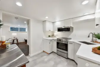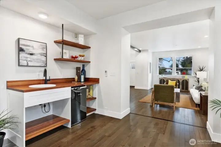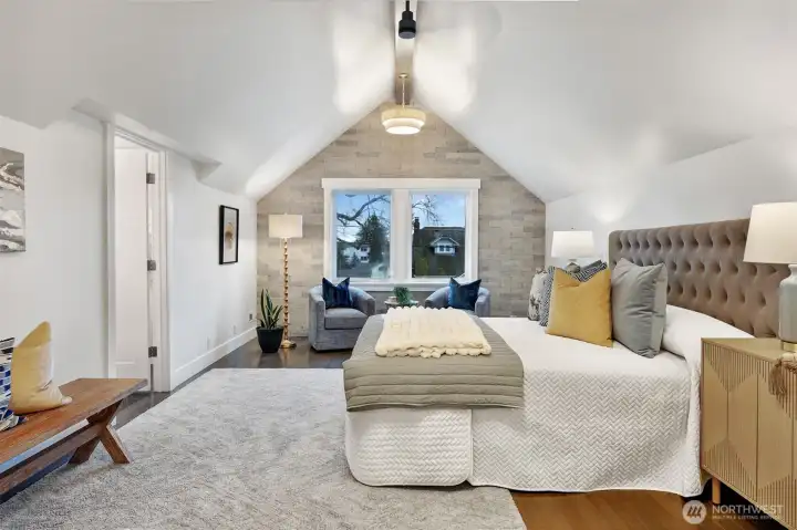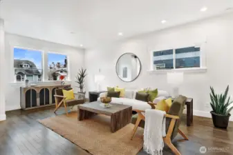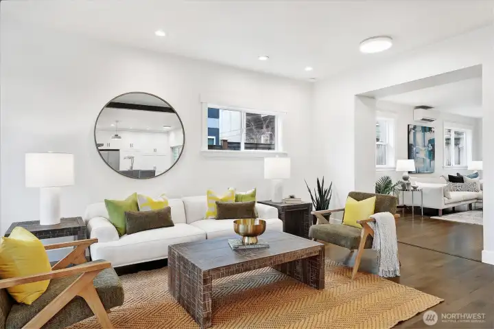This 5BR/4BA Greenwood Craftsman home is a rare gem, with the elegant footprint of a historic Old World Charm home complemented by every modern amenity you could want, including 3 upper-floor bedrooms (one of them a primary suite) & 2 bathrooms. All new systems throughout, including solar & air conditioning. Rebuilt from the foundation up in 2018-19, this builder-owned home is crafted to perfection. Enjoy the gracious flow of the main floor – with abundant natural light, open-concept living, dining, kitchen, and bedroom – plus a bonus media room and coffee/wet bar. The contemporary kitchen with quartz counters and custom tile is anchored by a generous island, perfect for home chefs to entertain and remain part of the action around them. Adjoining patio for indoor/outdoor entertaining. The stunning primary suite showcases vaulted ceilings, a to-die-for walk-in closet, and a tiled bathroom. The lower-level suite with a private exterior entrance offers one bedroom, three-quarter bath, and large living room – perfect for guests, nanny quarters, or multi-generational living. Step outside and enjoy the fully fenced yard, hardscape patio, ample greenery, three custom sheds with firewood cover and a double custom shed in the front yard with a living roof. Driveway parking for 2 cars, with EV charger. Just blocks to popular bus routes, sought-after grocers, and delicious cuisines.