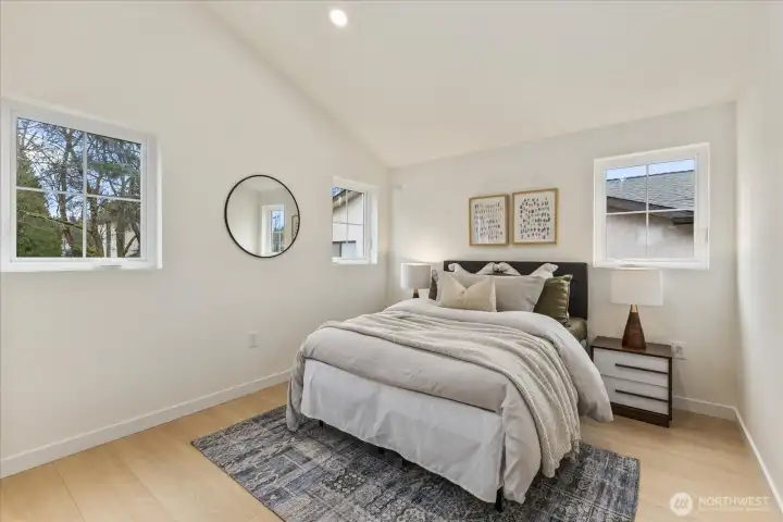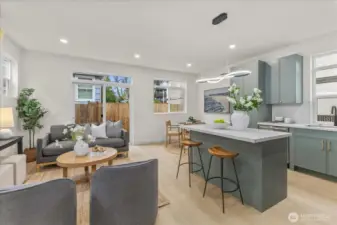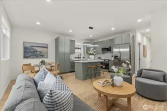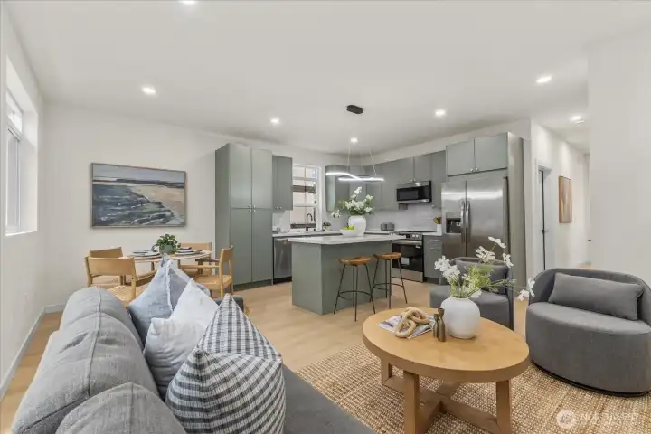 Tucked into a quiet setting in NE Seattle, this new construction home delivers a rare blend of modern design, smart layout, and effortless livability. Clean lines and a striking exterior welcome you inside to a light-filled interior where wide-plank flooring, oversized windows, and a soft contemporary palette create an airy, elevated feel. The open-concept main level is anchored by a sleek kitchen featuring stylish cabinets, quartz counters, and stainless appliances—flowing seamlessly into living and dining spaces designed for everyday comfort and easy entertaining. Entertain around the island with bar. Main level also offers a powder room for convenience. Upstairs, two spacious bedroom suites provide privacy and flexibility. Two beautifully finished baths showcasing modern tile work and refined fixtures. Thoughtful details like mini-split heating and cooling, efficient use of space, and abundant natural light enhance the home’s livability year-round. Outside, enjoy a low-maintenance setting with room to relax or host. This is modern Seattle living—stylish, efficient, and move-in ready.