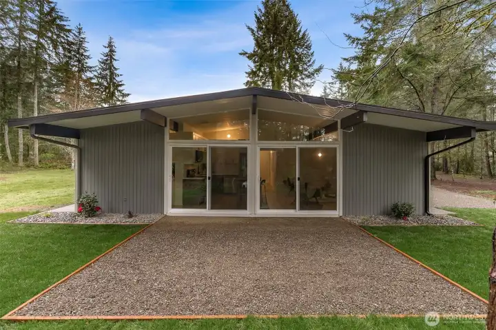 Fully reimagined stunning top-to-bottom remodel! A 768 sq ft home on 2.3 acres nestled among towering Pacific Northwest evergreens on private, park-like property, this architectural gem delivers the perfect blend of timeless layout and modern design. Step inside to tongue-and-groove vaulted ceilings, 2-bedroom 1-bathroom, open-concept living and dining area that floods with natural light, and seamless indoor-outdoor flow via oversized sliding glass doors to a spacious gravel patio ideal for entertaining. The kitchen is a showstopper featuring two-tone cabinetry (sage green lowers, crisp white uppers), quartz countertops with full slab backsplash, and a complete suite of new stainless appliances including a range, over-the-range microwave, dishwasher, and refrigerator. Towards the back of the house, a convenient laundry space that joins both function and design. The property includes a detached garage/shop, additional outbuildings, and generous usable acreage with endless potential for a hobby farm, homestead, garden retreat, or future development. Gravel circular driveway with ample parking. Minutes to Port Orchard amenities, Hwy 16, and the Southworth Ferry. Whether you're seeking a private primary residence, vacation retreat, or investment property, this home is a must see!