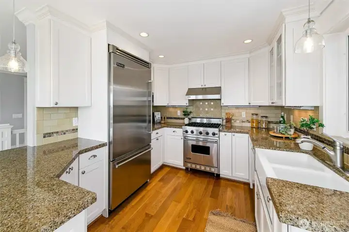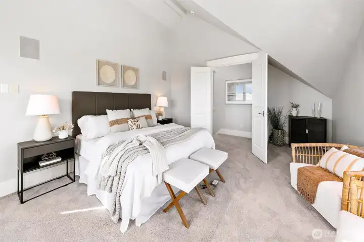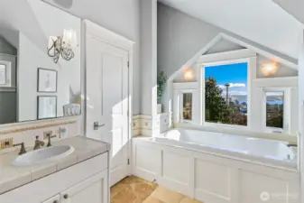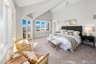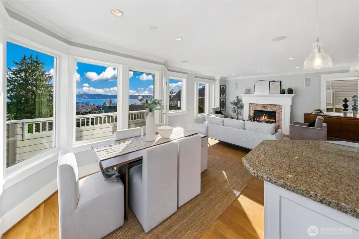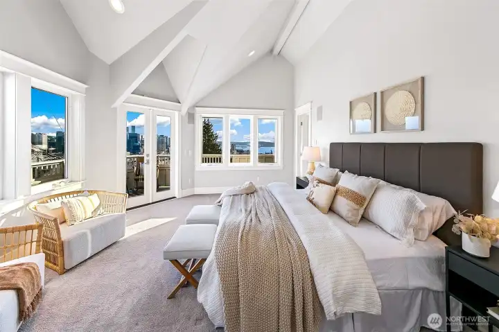 Incredible city and water views from a quiet street on top of Queen Anne. South-facing windows showcase a Frasier-style view of the Space Needle, Cascades, Elliott Bay, Downtown Seattle, and Lake Union. Spacious rooms live gracefully: cozy up to the fireplace or gaze at the view from the large living room. Relax in the top-floor primary suite with its own view deck, soaking tub, separate shower, dual vanity, and large walk-in closet. Three additional bedrooms on the main and lower levels provide comfortable space for guests. Quality is obvious; cohesive craftsman-quality finishes with real materials like true wood floors and siding and quality millwork. A one-car garage and driveway offer convenient parking and storage. The top deck provides incredible privacy; a perfect setting for quiet mornings or sunset cocktails while taking in Elliott Bay. The multiple levels make this home a true haven; begin each morning with a sunrise - enjoy the separation with each floor offering its own space- then come together at day’s end to watch the cruise ships and ferries glide across the water. Easy, low-maintenance landscaping with beautiful year-round blooms and trees from the welcoming front approach to the ground-floor terrace. The home is set back from the street for privacy and discreet living, yet just blocks from some of Seattle’s best amenities—Queen Anne Boulevard, Trader Joe’s, Met Market, local restaurants and shops, and Seattle Center, Climate Pledge Arena, and SLU.