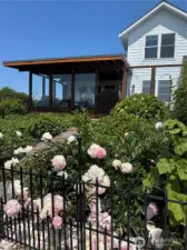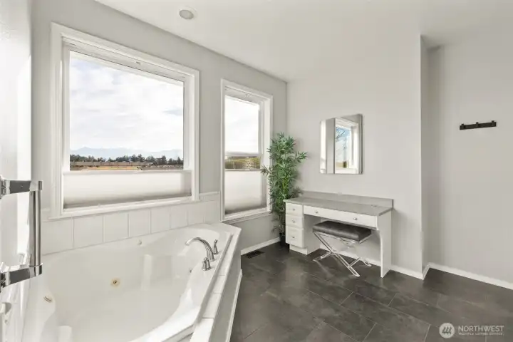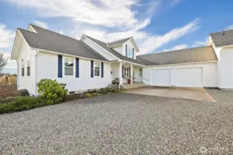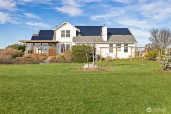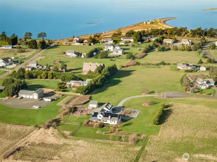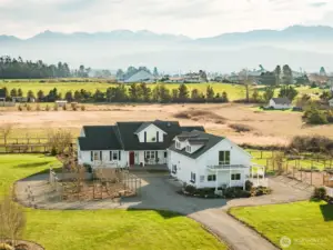 Embrace the best of elevated country living in the upscale Olympic Straits community, perfectly situated in sunny Sequim. This thoughtfully designed, custom home rests on 5 scenic acres with sweeping Olympic Mountain views and exquisitely landscaped grounds that evoke a serene natural setting. Vaulted ceilings, hardwood floors, a river-rock propane fireplace, and a wall of windows fill the interior with natural light while framing mountain vistas and lush gardens. The chef’s kitchen balances elegance and function with maple cabinetry, leathered granite countertops, large quartz island, and walk-in pantry. The spacious main-level primary suite is an owner’s sanctuary, showcasing a remodeled spa-inspired bath with a curbless shower, heated towel rack, and private laundry. The attached ADU provides flexible space for guest quarters, private office, gym, or multi-gen living with balcony water views. There is plenty of room for hobbies and storage with the double garage and workshop, while 35 solar panels and tankless propane water heater help offset utility costs and support energy efficiency. Low cost utility bills are a highlight! Outside enjoy fenced, irrigated gardens, raised beds, mature orchard, and a covered back deck overlooking a peaceful wetland buffer, creating a relaxing haven for birdwatching and entertaining. Picturesque and impeccably maintained, this home offers lasting tranquility and close proximity to all of the Olympic Peninsula’s premier outdoor adventures.
