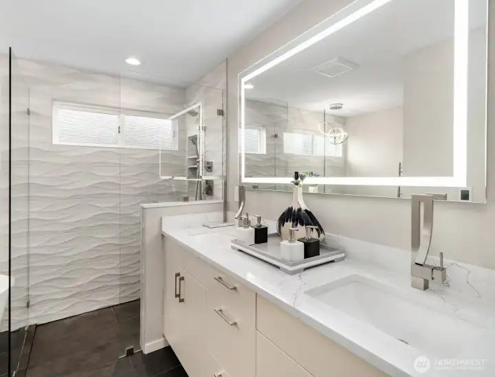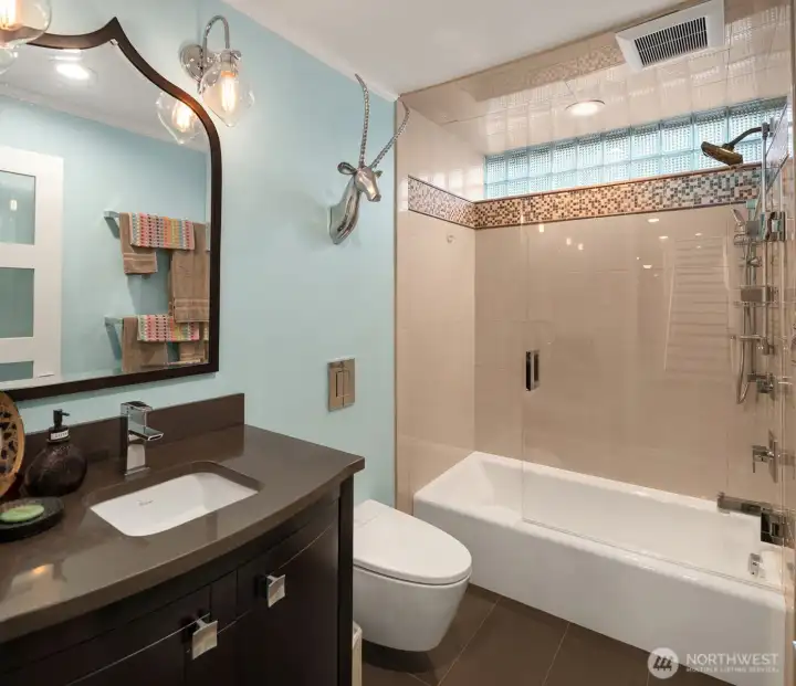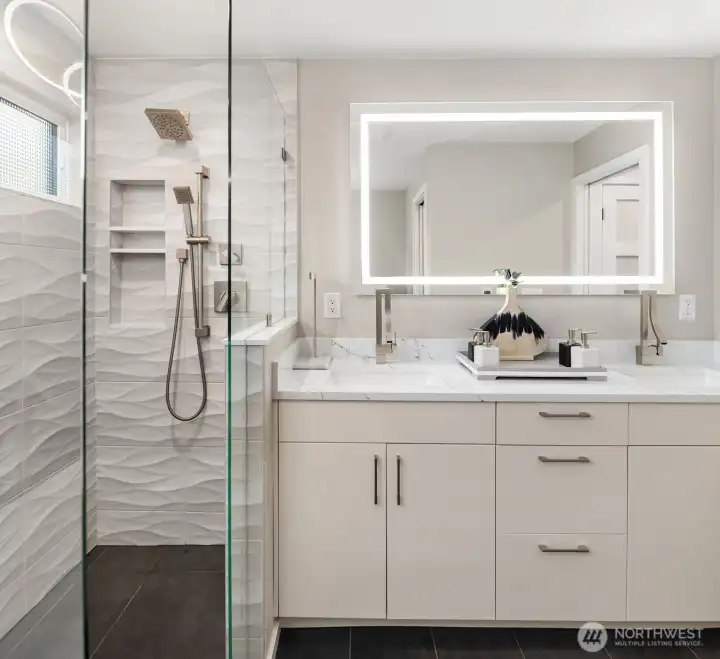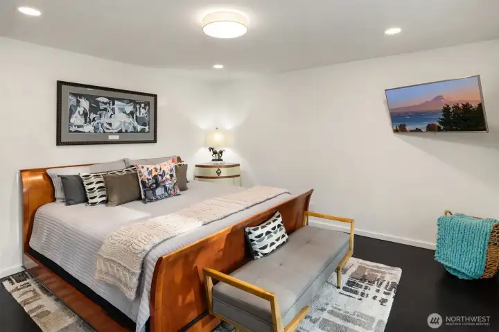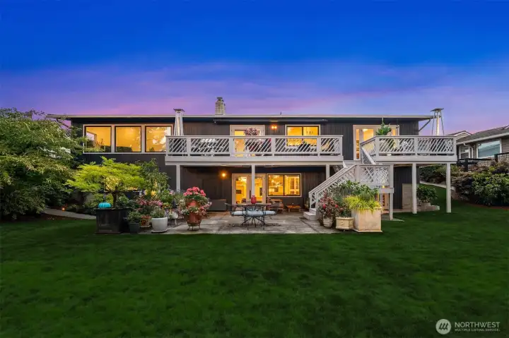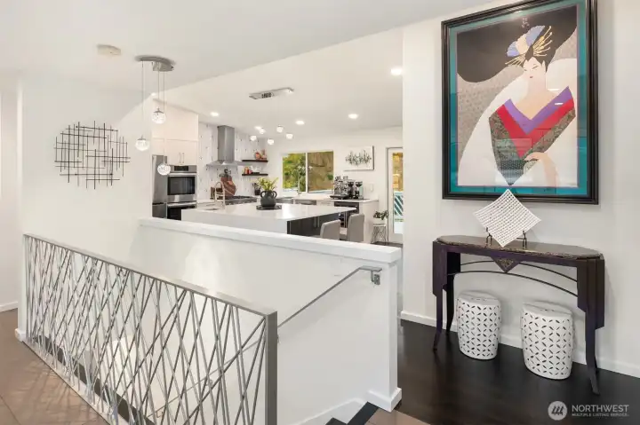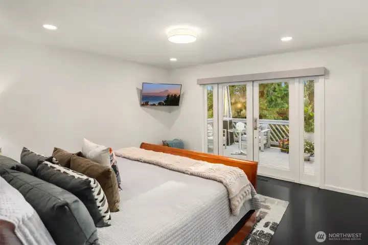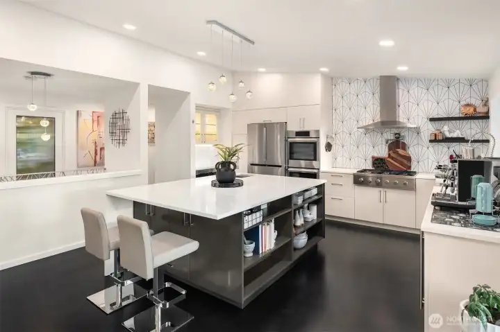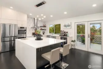 This beautifully renovated daylight rambler in Bellevue’s coveted Woodridge community offers elegant living space designed for comfort and connection. The open kitchen, created by removing walls between the original kitchen and dining room, features a large island with prep sink, soft-close cabinetry, quartz countertops, pot filler, and dual-temperature wine cooler — perfect for entertaining. Vaulted ceilings seamlessly connect the kitchen to the living room and back deck for alfresco dining. The master suite includes a luxurious bath with heated floors, a bidet, and private deck access. Custom California Closets with soft-close drawers maximize storage throughout the home. The finished basement, completed in 2019, offers versatile spaces including a gym with custom closets and a guest/craft room with a queen Murphy bed. The family room boasts a new gas fireplace, built-in entertainment center, and a quartz-topped wet bar with wine storage. French doors lead to the backyard. Additional upgrades include a Navien tankless water heater (2024), heated bathroom floors, new roof, skylights, updated garage doors, double-pane windows, and modern interior finishes. Located just four blocks from Woodridge Elementary on a quiet street, this home blends modern upgrades with timeless charm in one of Bellevue’s best school districts.