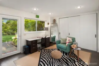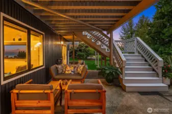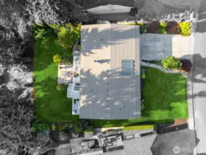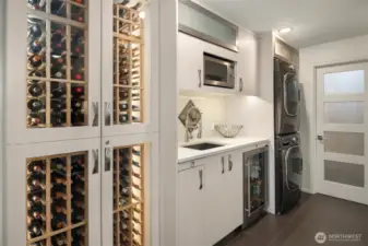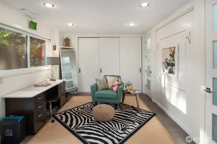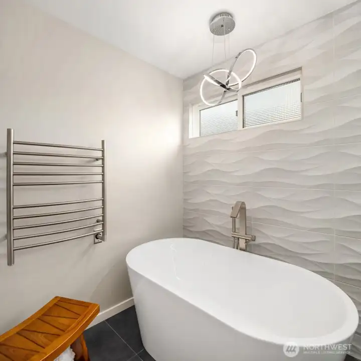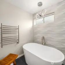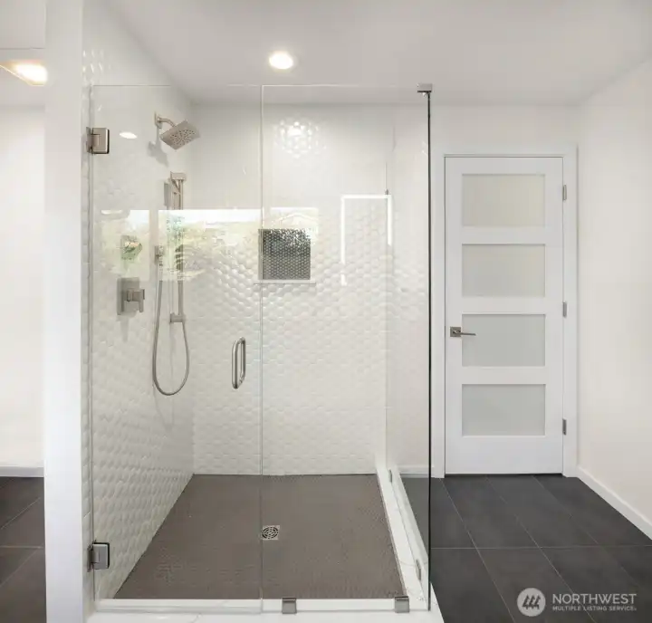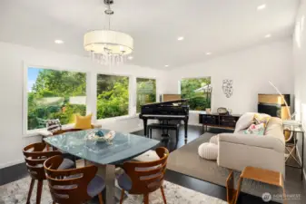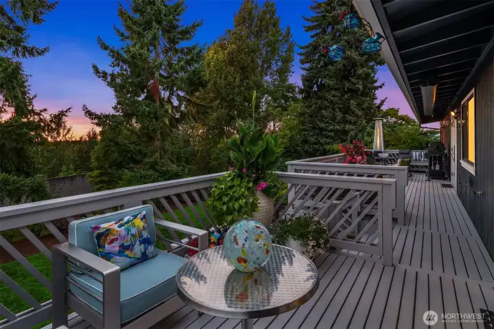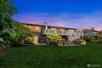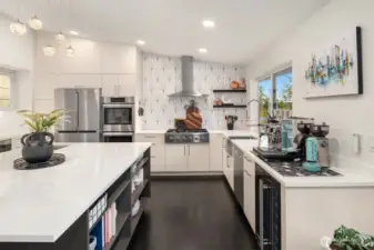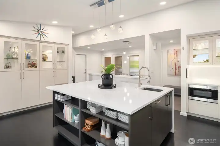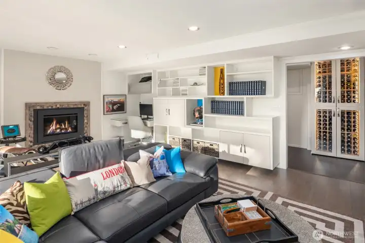 This beautifully renovated daylight rambler in Bellevue’s coveted Woodridge community offers elegant living space designed for comfort and connection. The open kitchen, created by removing walls between the original kitchen and dining room, features a large island with prep sink, soft-close cabinetry, quartz countertops, pot filler, and dual-temperature wine cooler — perfect for entertaining. Vaulted ceilings seamlessly connect the kitchen to the living room and back deck for alfresco dining. The master suite includes a luxurious bath with heated floors, a bidet, and private deck access. Custom California Closets with soft-close drawers maximize storage throughout the home. The finished basement, completed in 2019, offers versatile spaces including a gym with custom closets and a guest/craft room with a queen Murphy bed. The family room boasts a new gas fireplace, built-in entertainment center, and a quartz-topped wet bar with wine storage. French doors lead to the backyard. Additional upgrades include a Navien tankless water heater (2024), heated bathroom floors, new roof, skylights, updated garage doors, double-pane windows, and modern interior finishes. Located just four blocks from Woodridge Elementary on a quiet street, this home blends modern upgrades with timeless charm in one of Bellevue’s best school districts.