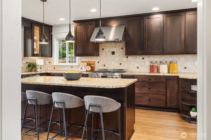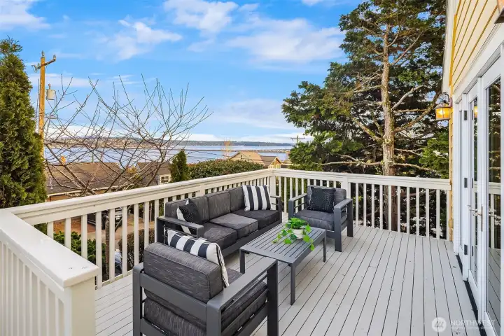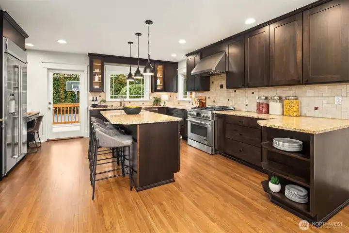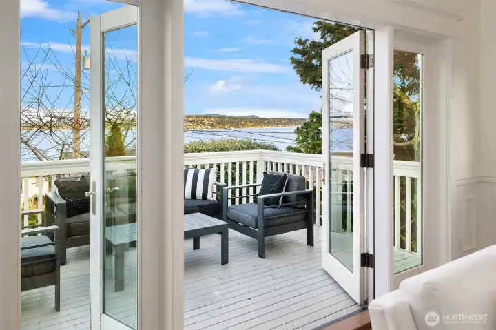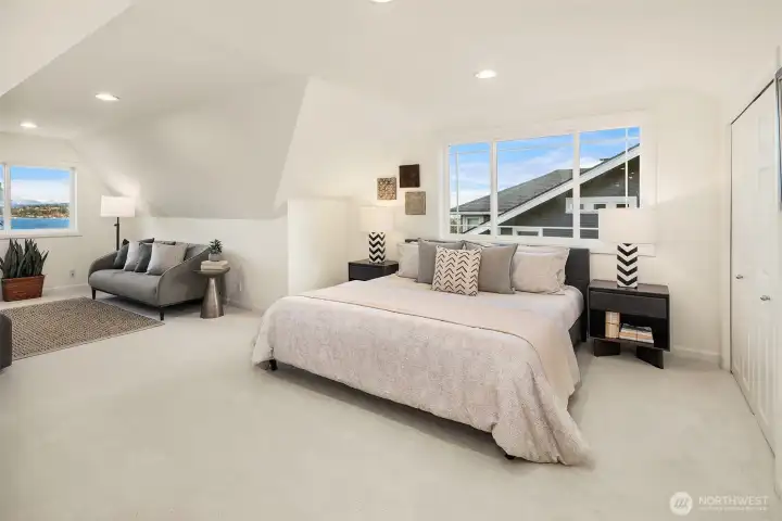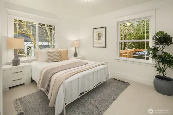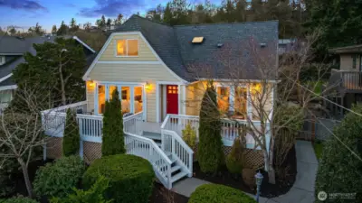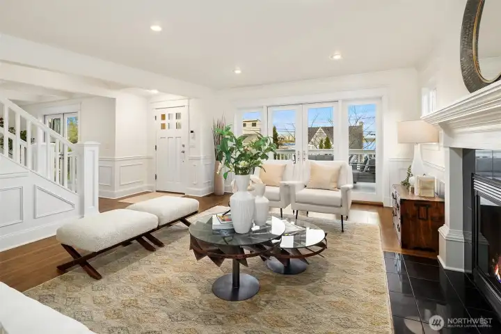 A Leschi home that fully embraces its setting—classically styled, light-filled, and offering sweeping views of Lake Washington, the Cascades, Mt. Rainier, and the Bellevue skyline. Thoughtfully remodeled and refreshed throughout, the interiors feel both elevated and familiar, with richly refinished hardwoods, new carpet, and fresh paint creating a clean, cohesive backdrop. A dramatic living room sets the scene immediately. Anchored by a fireplace and grounded by traditional wainscotting, this generously proportioned room expands through French doors onto the dramatic front deck overlooking the lake. The kitchen elevates with Jenn-Air appliances, granite counters, and custom cabinetry, flowing seamlessly into the dining room or back yard. The lower level offers flexibility for how you want to live, with a spacious rec room, wet bar, wine cooler. There’s a gracious guest suite with private entrance and bath—ideal for extended stays or future ADU potential. Outside, an oversized, level backyard provides privacy and room to create. Out front you’ll find mature landscaping and a detached one-car garage. All just moments from Leschi’s neighborhood staples—grab a bottle and something simple at Leschi Market on your way home, or settle in for waterfront dinners at Daniel’s, with parks and everyday essentials just beyond.