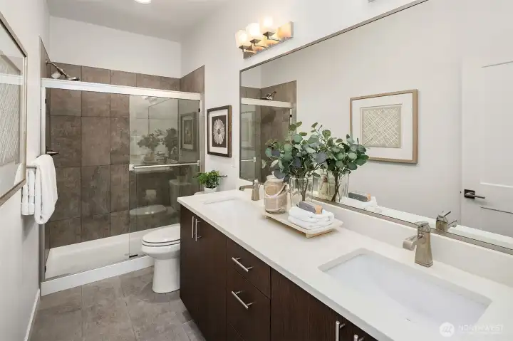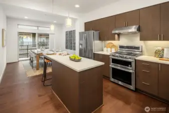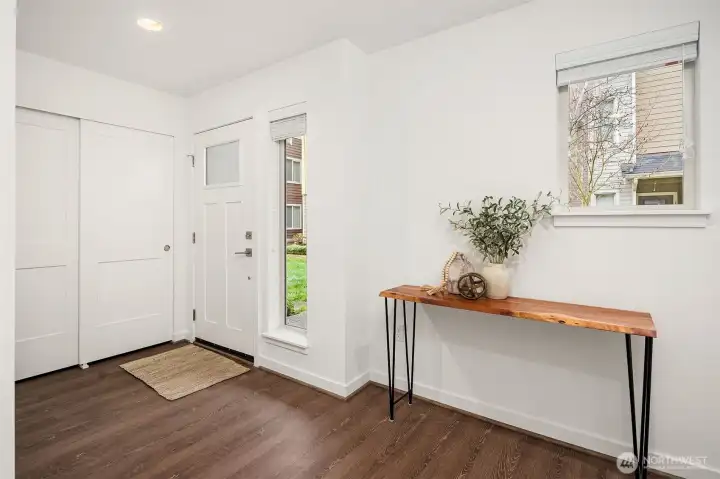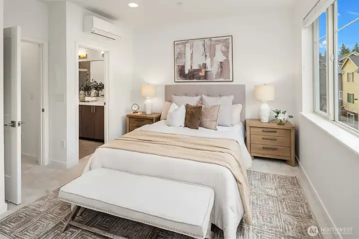 Generous east and west-facing windows fill this modern home with abundant natural light, while two mini-splits provide year-round comfort. The open-concept living area showcases gorgeous engineered hardwood floors and flows seamlessly from the living room to the kitchen and dining area, extending out to the deck—perfect for entertaining as well as comfortable everyday living. The stylish kitchen features quartz countertops, glass tile backsplash, island with breakfast bar, pendant and under-cabinet lighting, and stainless steel appliances. The primary suite offers a private ¾ bathroom with a dual-sink vanity and a tile shower. A second bedroom with an adjacent full bathroom is just down the hall. Additional highlights include a laundry closet with storage space, courtyard entry with a coat closet and direct access to the tandem 2-car garage, new carpet, and fresh interior paint. Pet-friendly community with no rental cap. Prime location with convenient access to Microsoft's main campus, downtown Bellevue and Redmond, plus abundant nearby amenities including shopping, dining, community parks, Lake Sammamish, and freeway access.