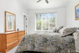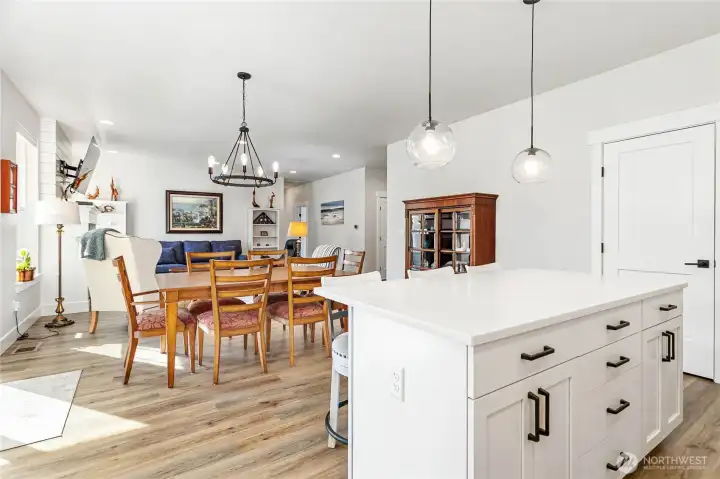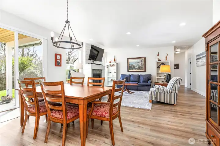 Effortless single-level living with a modern edge! This open-concept home impresses with vaulted ceilings, a cozy gas fireplace, and a layout that flows seamlessly for everyday living and entertaining. The chef’s kitchen is a showstopper—quartz counters, tile backsplash, rich luxury vinyl plank flooring, undercabinet lighting, pull-out drawers in the cabinets, and a walk-in pantry ready for it all. The primary suite is a true retreat, featuring a very spacious bathroom and a large walk-in closet. Tucked against a peaceful greenbelt, you’ll love the privacy and abundant natural light. Step out to the large covered patio—perfect for year-round relaxing or hosting—while your backyard features fruit trees and in-ground irrigation for easy care and a touch of sweetness! Stay comfortable with central A/C, and enjoy upgrades like natural gas appliances and a tankless hot water system. This home is clean, efficient, and move-in ready—the total package!