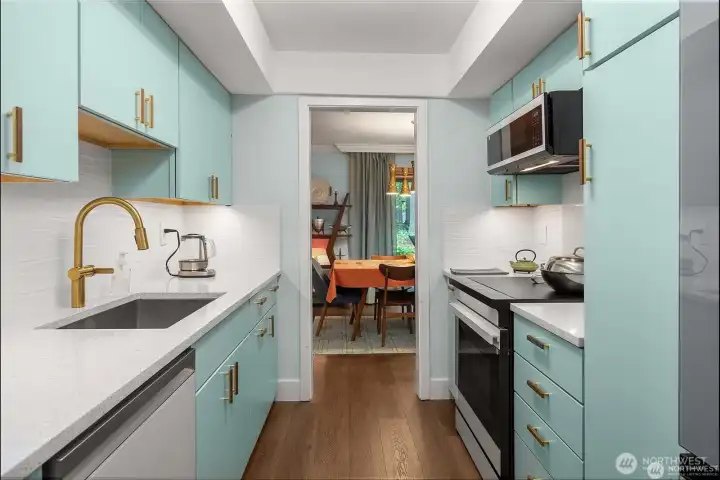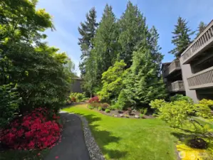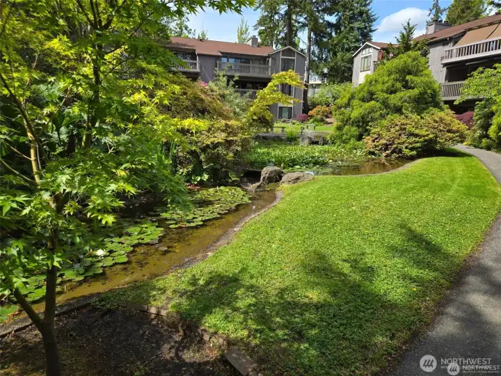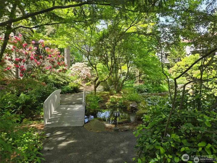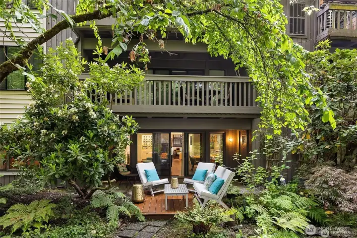 Discover a rare garden-level sanctuary, beautifully remodeled with exceptional quality and designed for those who appreciate space, tranquility, and style. This expansive 1,768 sq ft residence feels like a private retreat, featuring a real wood-burning fireplace and a patio that leads to a secluded deck—ideal for relaxing on cool evenings or hosting summer BBQs. Sunlight floods in through generous windows, framed by a lush, curated garden of native plants and mature trees, providing a calming, nature-inspired backdrop throughout the home. As you step inside, you’ll find an inviting open floor plan anchored by a fully modernized kitchen, alongside formal and casual dining spaces, and a built-in wet bar. The primary bedroom includes a full ensuite bathroom and a walk-in closet, a second bedroom plus a den that easily serves as a home office. Nestled within an exclusive 6-acre gated community, residents enjoy resort-style amenities, including a pool, spa, clubhouse, and two reserved parking spaces.