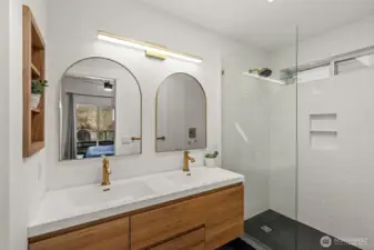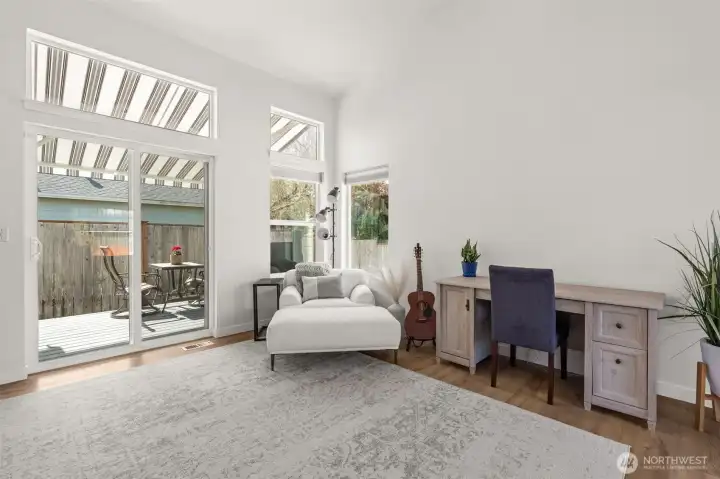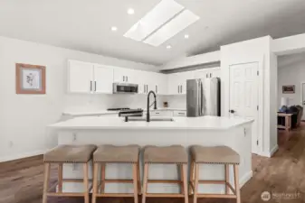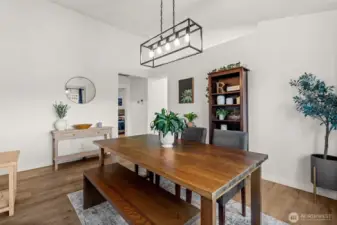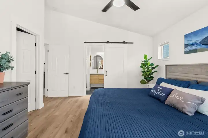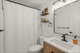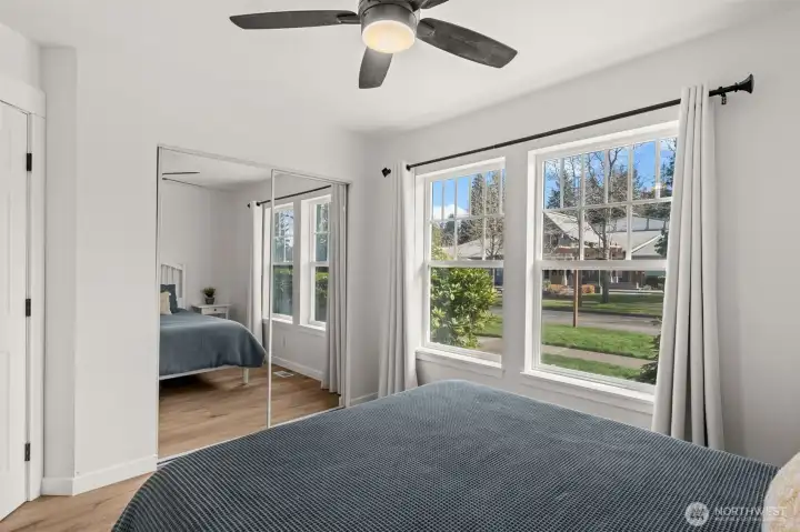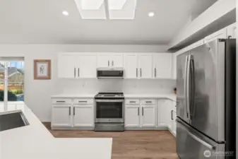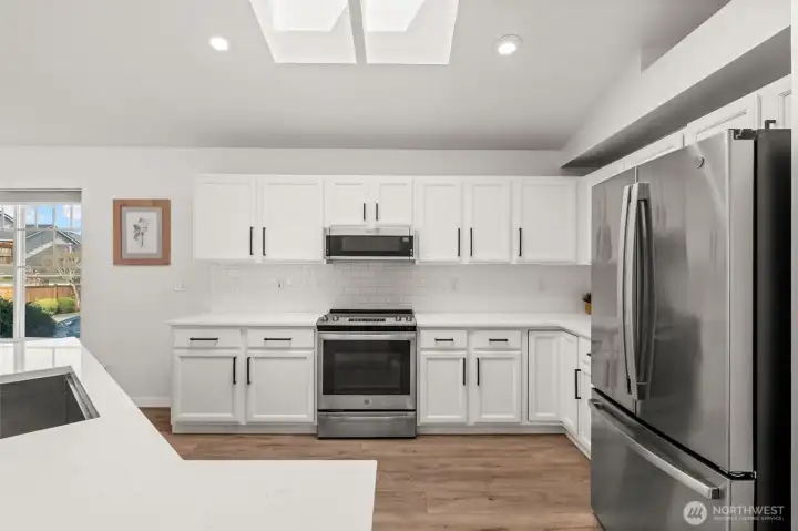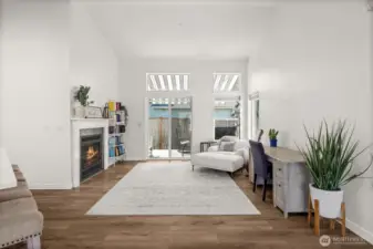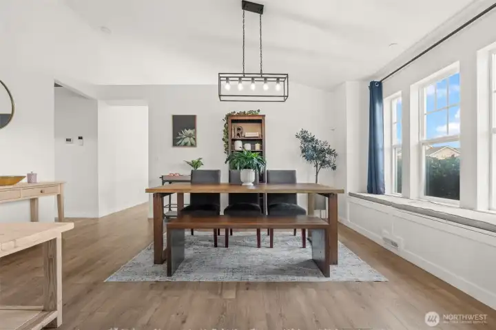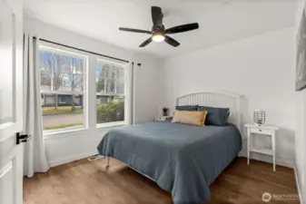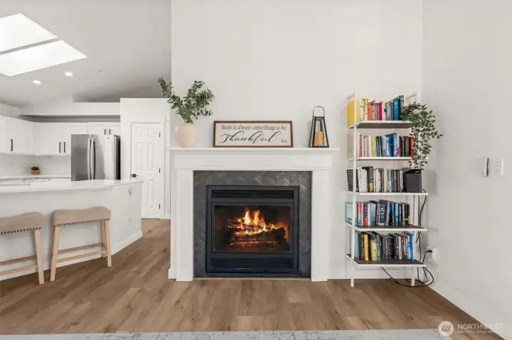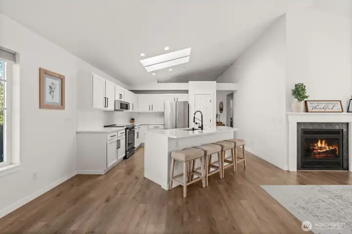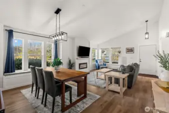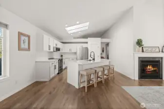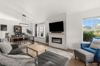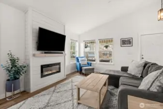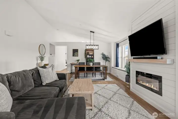 A stunning rambler on a corner lot in the heart of DuPont’s NW landing, this home will not last long! Walk through the entrance and immediately soak in the natural light with the vaulted ceilings and soaring windows in the living room. Enjoy a stylish electric fireplace as the center-piece of the living space with a built-in storage bench under the window, a perfect reading or coffee spot during quiet hours. As you transition into the kitchen, you are immediately met with an updated kitchen with quartz countertops, stainless steel appliances, and a large island with an overhang. Find the additional living space adjacent to the kitchen with a gas fireplace leading to the sliding glass door to the newly installed trex deck in the back yard. Off of the main living room, you’ll find all three bedrooms. The primary has a walk-in closet and an attached bath that’s been upgraded with matte black tile on the floors, a floating double vanity, and a beautifully tiled shower. The primary also has a sliding glass door to the back deck. Separated from the primary are two guest rooms and the updated guest bath. This home has no stone unturned! The roof is 3 years old, there’s new LVP or tile throughout the home, every wall has been painted, a new trex deck, and there’s a minisplit that can easily be converted to central A/C! Just across the street from Chloe Clark Elementary school and less than 5 minutes from JBLM North and Main post, you can’t ask for a better place to live in DuPont!