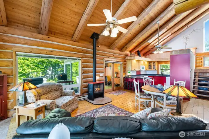 Experience the magic of waterfront living with 102 ft of high bank frontage, offering spectacular westerly sunset views over Cypress Island, the Olympic Mts and Bellingham Channel. Quality, 2006 SF, custom log home blends rustic charm w/ modern comfort, featuring vaulted ceilings and a wall of windows to let the natural light and views in. Remodeled kitchen with abundant cabinetry and newer appliances. Main level primary bedroom and en-suite bath with direct access to a deck. Upper level has two additional bedrooms and one full bath providing a comfortable space for guests or family. Large landing can be used as an office space. Expansive decks on both the upper and main level. 798 SF car garage plus attached shop offers excellent storage and workspace. Sunroom with woodstove for a cozy place to relax. Main level laundry room. Community beach access completes this wonderful island living experience. Guemes Island is only a 7-minute ferry across the Guemes Channel from Anacortes.
