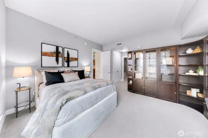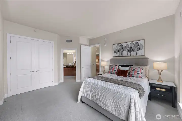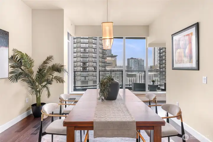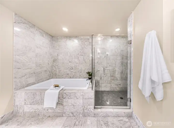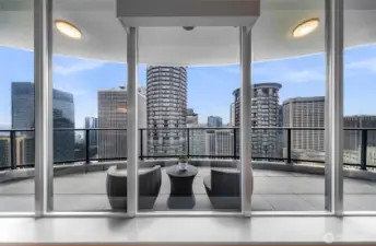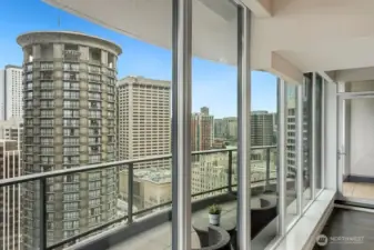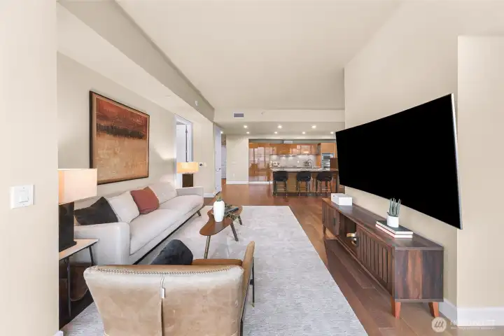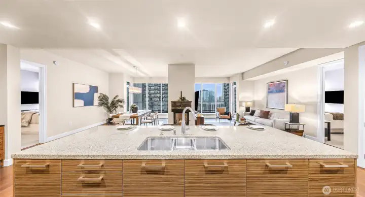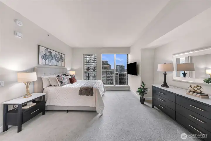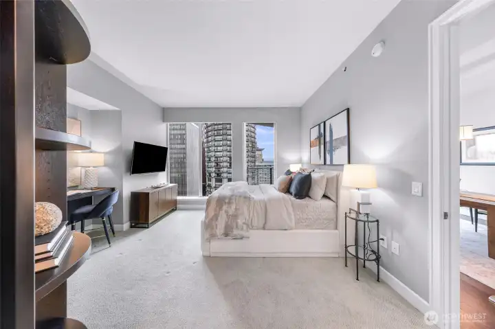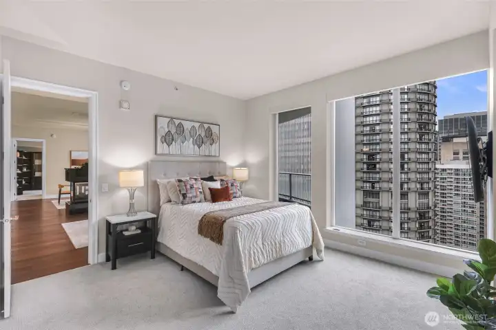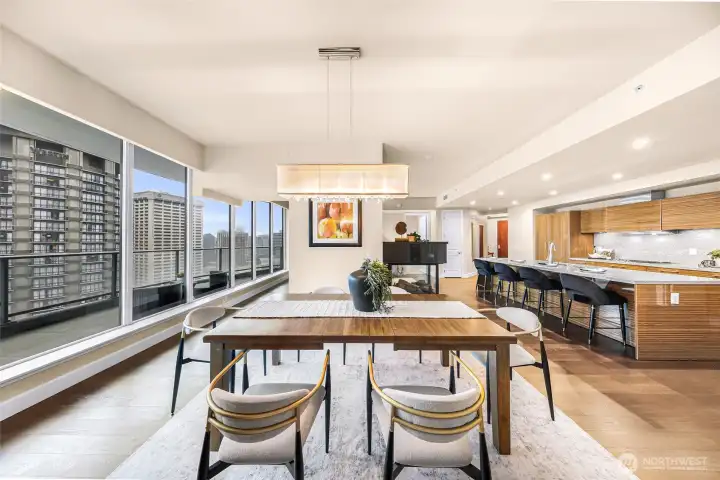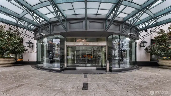 Elevated living at Escala—one of downtown Seattle’s premier luxury residences. A private elevator opens to your own vestibule, leading into nearly 2,000 square feet of refined, thoughtfully designed interiors. A sleek gas fireplace anchors the living, dining, and kitchen spaces, creating warmth and flow for everyday living and cozy Pacific Northwest evenings. Step out to the expansive private balcony for sweeping city views, including a stunning look at the Space Needle. The primary suite is a true retreat with a spacious walk-in closet and a luxurious five-piece bath. A second bedroom with its own full bath sits on the opposite side of the home, offering ideal flexibility for guests, a home office, or media space. Two dedicated parking spaces and a separate storage unit complete the home. Escala residents enjoy 24-hour concierge service and exceptional amenities, including a fitness center with resistance pools and yoga studio, spa treatment rooms, private dining and event spaces, theater, outdoor terrace, and dog run. Just blocks from Pike Place Market with easy access to transit, downtown employers, and everything the city has to offer—this is urban living with comfort, privacy, and ease.