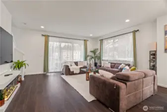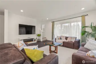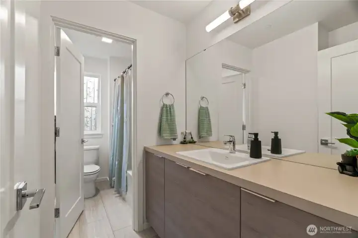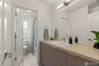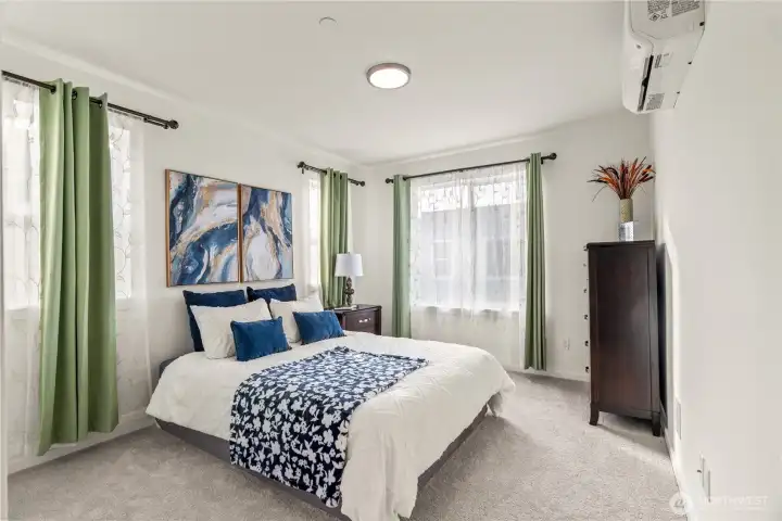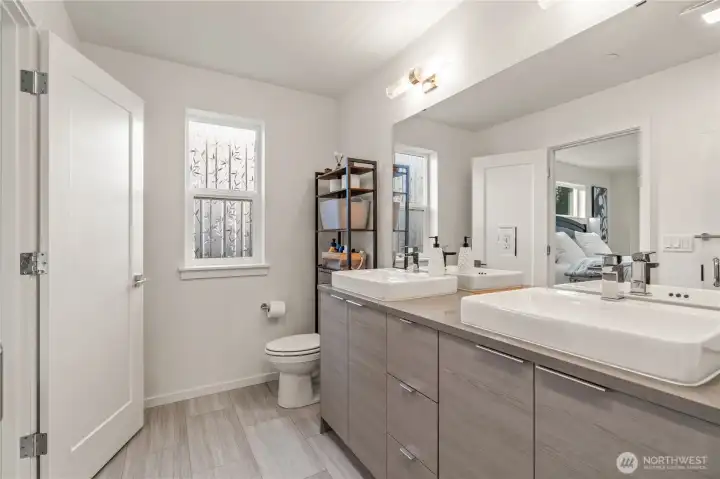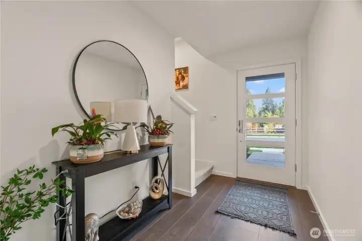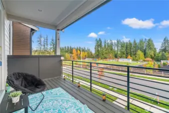 East-facing, park-front MainVue home at Elmbrook – The Spruce floorplan. This beautifully designed end-unit offers modern elegance across three levels, featuring an extended covered porch with direct park views, a welcoming foyer, and a private guest suite on the entry level. The main level is designed for both comfort and style, with a chef’s kitchen showcasing Quartz countertops, sleek European cabinetry, premium KitchenAid appliances, a walk-in pantry, and a dedicated study nook. A covered deck extends your living space outdoors with serene park-facing views. Upstairs, retreat to a luxurious primary suite complete with a walk-in closet and a spa-inspired bath with dual Quartz vanities. Enhanced with air conditioning on every level, ensuring comfort throughout the home during warmer months. Ideally situated across from Fernwood Elementary and just minutes from North Creek High School — a rare blend of location, design, and lifestyle.