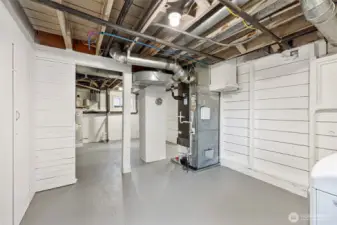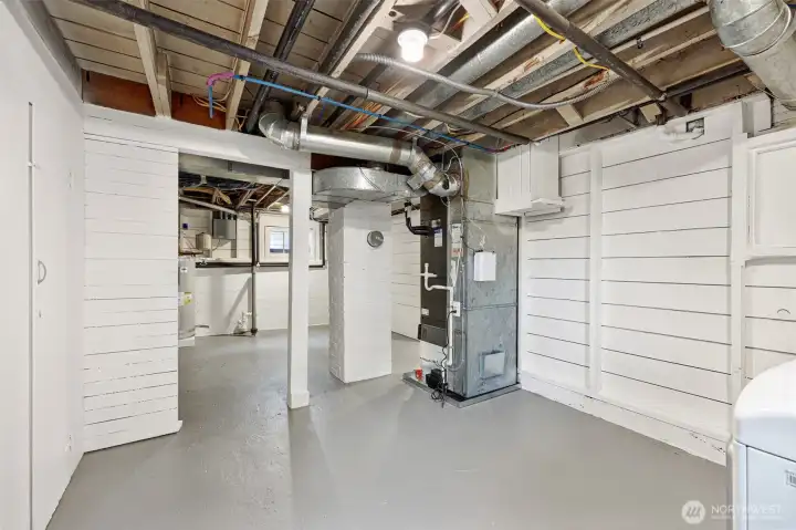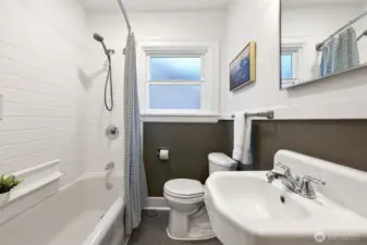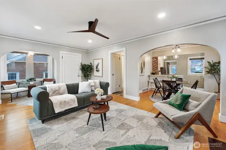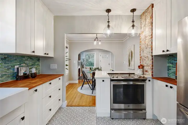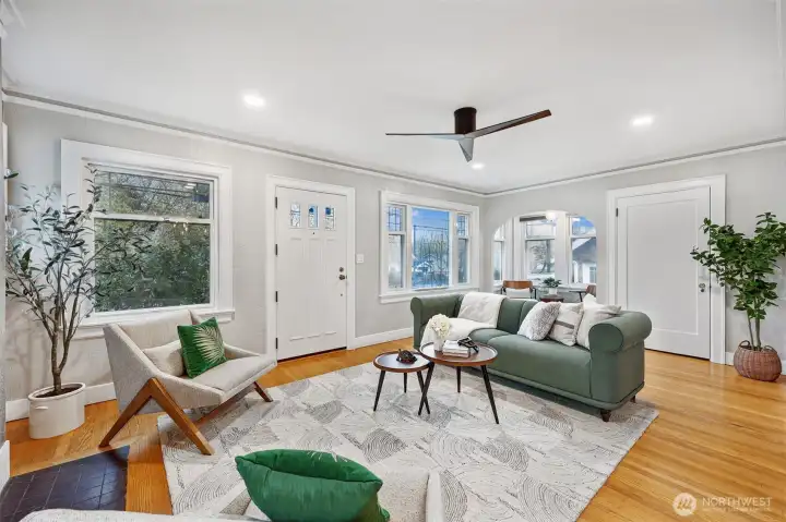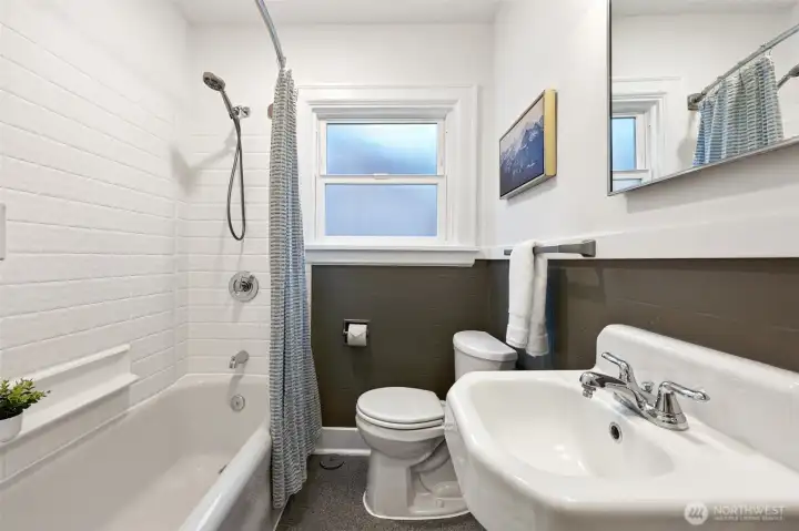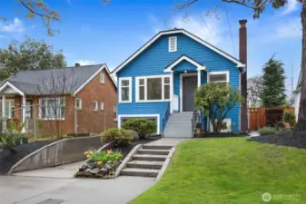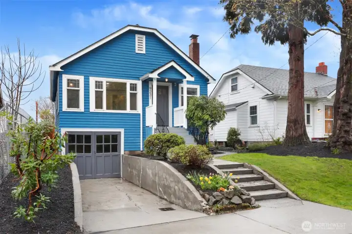 Classic 1928 charm meets impactful modern updates in this beautifully maintained home, set up off the street for added privacy and stately presence. Inside, period details pop—exposed brick, original oak hardwoods, crown moulding & picture rail, and vintage glass doorknobs pair effortlessly with everyday functionality. The welcoming living room features a wood-burning fireplace, large coat closet, and inviting sunlit window-wrapped nook. A dedicated dining room flows into the spacious modern kitchen complete with pull-out storage and soft close cabinetry & stainless appliances. Bar seating and a nearby back door make hosting BBQs this summer a no brainer as the spacious, private, and thoughtfully landscaped west-facing backyard will turn you into a green thumb in no time! One bedroom, full bath and former back porch turned great home office flex space completes the main floor. Downstairs, a 2nd bedroom plus lots of clean, unfinished space ideal for storage or a home gym. This home has been extensively improved to set you up for long-term ease and peace of mind. Major updates include full rewiring, a new electrical panel, 2023 roof & solar panels, modern insulation, fresh interior paint, plus conversion to efficient electric heat with a heat pump for AC. Plenty of driveway parking in addition to an attached garage equipped with EV charging, or hop on bus 107 steps from your front door! A rare blend of character, comfort, and smart investment in a fantastic neighborhood.