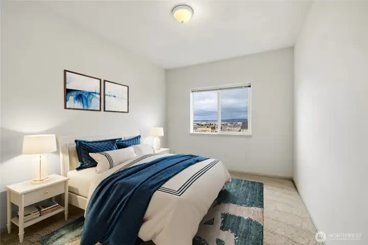 Perched on the top floor, this northwest corner 2-bedroom, 2-bath condo holds one of the most coveted positions in the building, providing added privacy, abundant natural light, and views from every room. The bright, open-concept layout flows effortlessly, with expansive west-facing windows showcasing breathtaking vistas of the Sound, Whidbey Island, Hat Island, and the Olympic Mountains, all set against unforgettable sunsets. Step out onto the private balcony, complete with a convenient storage closet, where morning coffee and evening unwinding come with beautiful views. The spacious primary suite offers a true sense of retreat, featuring a walk-in closet and a generously sized bath. Additional highlights include secure building entry, elevator access with zero stairs to the unit, and secure garage parking. Ideally located just minutes from the Everett Marina, Waterfront Place, downtown, and Angel of the Winds Arena. Enjoy close proximity to scenic parks, golf course, library, and hospital, along with exceptional walkability to restaurants, cafes, pubs, wine bars, and shops. Welcome to a lifestyle of scenic surroundings and everyday ease! Photos are virtually staged.