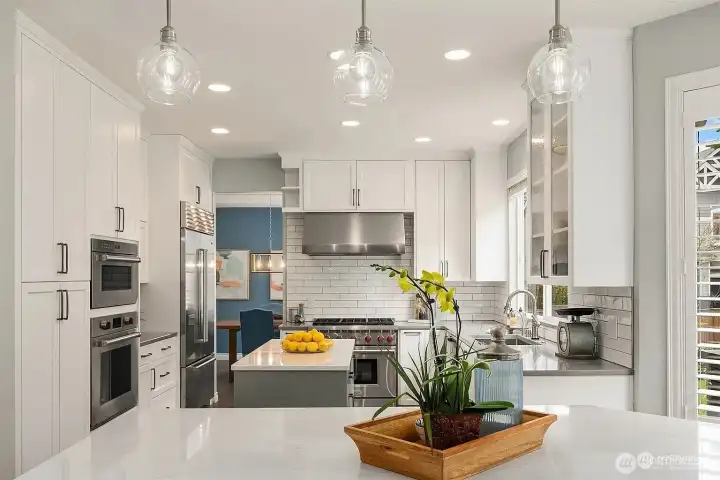 Beautifully updated east-facing home just steps from top-rated schools, offering exceptional indoor-outdoor living and high-end designer upgrades throughout The home includes 4 bedrooms, 2.5 bathrooms, and a versatile bonus/media/Office room. Renovated in 2020, the home features premium custom cabinetry across the kitchen, bedrooms, den, upstairs landing, and media room—creating a cohesive look with abundant storage. Each bedroom includes custom closets for organized, clutter-free living. At the heart of the home is a chef’s kitchen with a prep island and oversized waterfall island, custom cabinetry, Wolf range, hood and oven, Sub-Zero refrigerator, wine fridge, and rich hardwood flooring—perfect for everyday living and entertaining. Hardwood floors run throughout, with new carpet in the media room (2023). The primary suite offers a spa-like retreat with a five-piece bath, radiant heated floors, soaking tub, walk-in shower, and custom closet. Enjoy a thoughtfully designed outdoor space with a Trex deck, built-in BBQ, paver patio, and wood-burning fireplace. The landscaped yard features low-maintenance turf and fruit trees including apple, fig, pear, persimmon, grapes, and strawberries. Additional highlights include a 3-car garage with custom storage and a new roof (2025). Move-in ready in a highly desirable neighborhood.