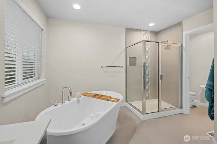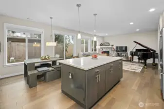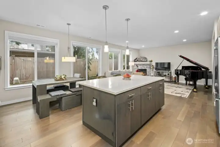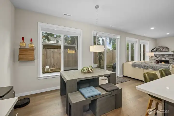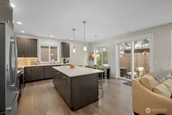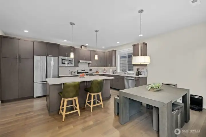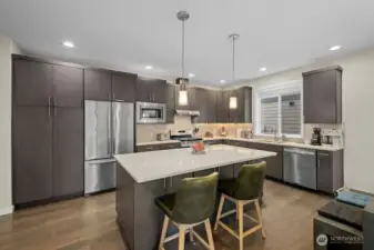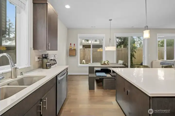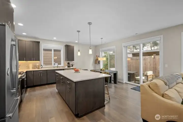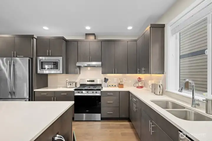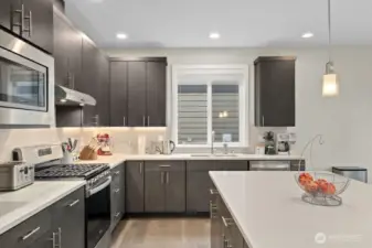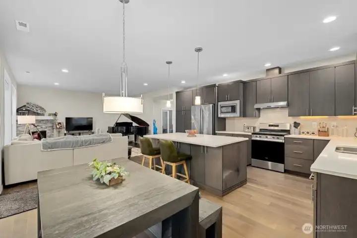 Turnkey modern living in Ashwood Court, built in 2021, offering 2,581 sq ft of thoughtfully designed living space on a corner lot in Edmonds. This 5-bed + den home features wide-plank LVP flooring throughout & bright, modern kitchen with quartz countertops, center island, stainless steel appliances, subway tile backsplash, and 4-burner gas range. Open-concept great room is anchored by a gas fireplace, with a sliding door that seamlessly extends living & entertaining to the fully fenced backyard complete with low-maintenance turf and patio pavers. Upstairs, double doors lead to the generous Primary Suite featuring vaulted ceilings, ceiling fan, & luxe 5-piece bath with soaking tub, large walk-in shower, floating dual vanity, & walk-in closet with built-ins. Dedicated laundry room with storage cabinetry. 2-car attached garage with durable epoxy floors. Walkable to Edmonds Woodway, Bar Dojo, & 5-corners. Seconds to Swedish & Edmonds Bowl.